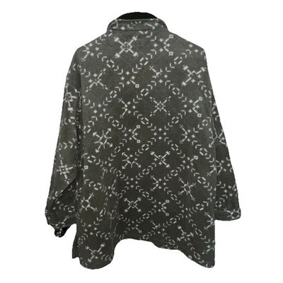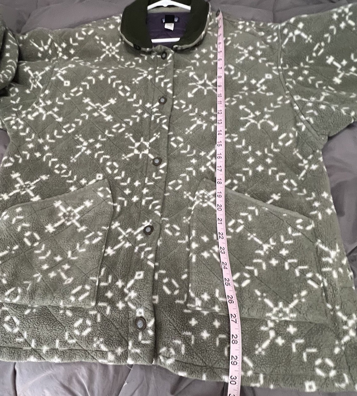 The VTG Patagonia Sherpa Fleece Barn Chore Jacket is a vintage women's jacket in size L, made in the USA. It features a geometric green pattern with a mid-length design and long sleeves, perfect for travel, casual wear, or work. The jacket is lined with polyester fleece and has a relaxed fit, making it ideal for outdoor activities in winter or fall. With its button-down closure, zipped pockets, and accent buttons, this Patagonia jacket combines style and functionality for a timeless look.