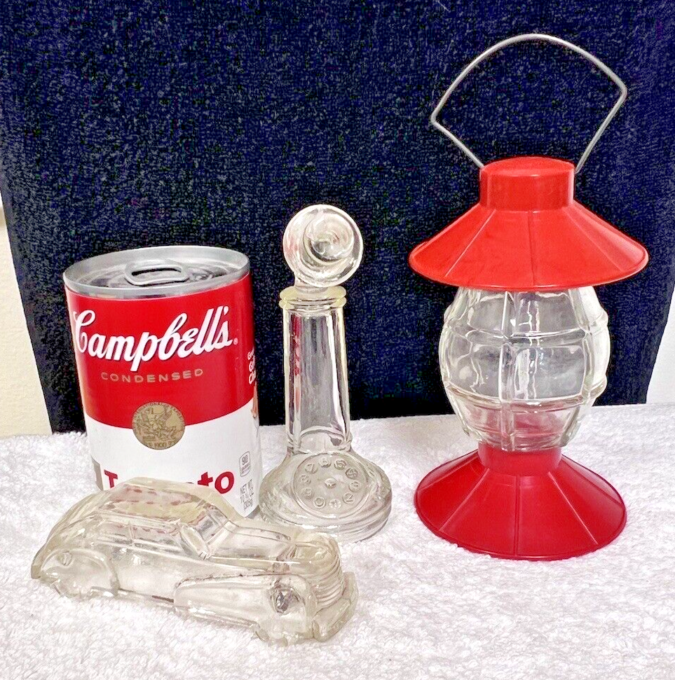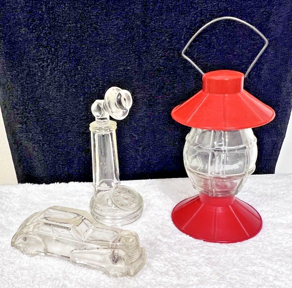3PC Vintage Candy Containers Candlestick Phone Railroad Lantern Car Auto Glass