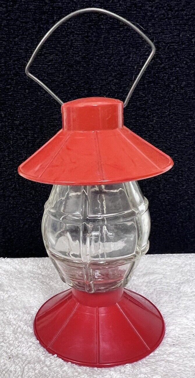 Lantern and mix of red plastic glass with a metal handle 5 1/2 to top of round 7 inches with the handle base is 3 1/4 inches