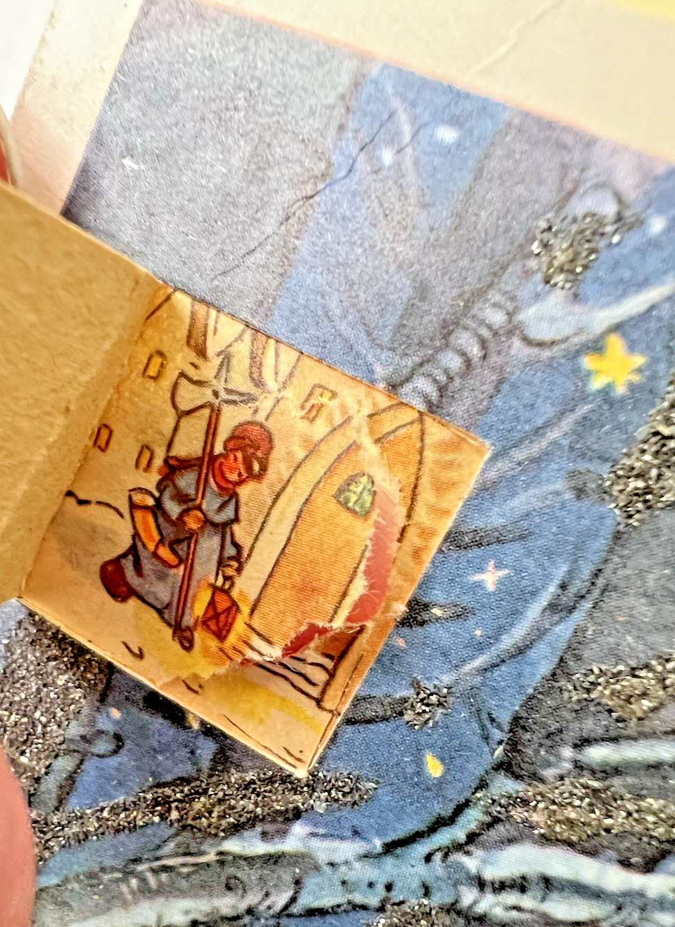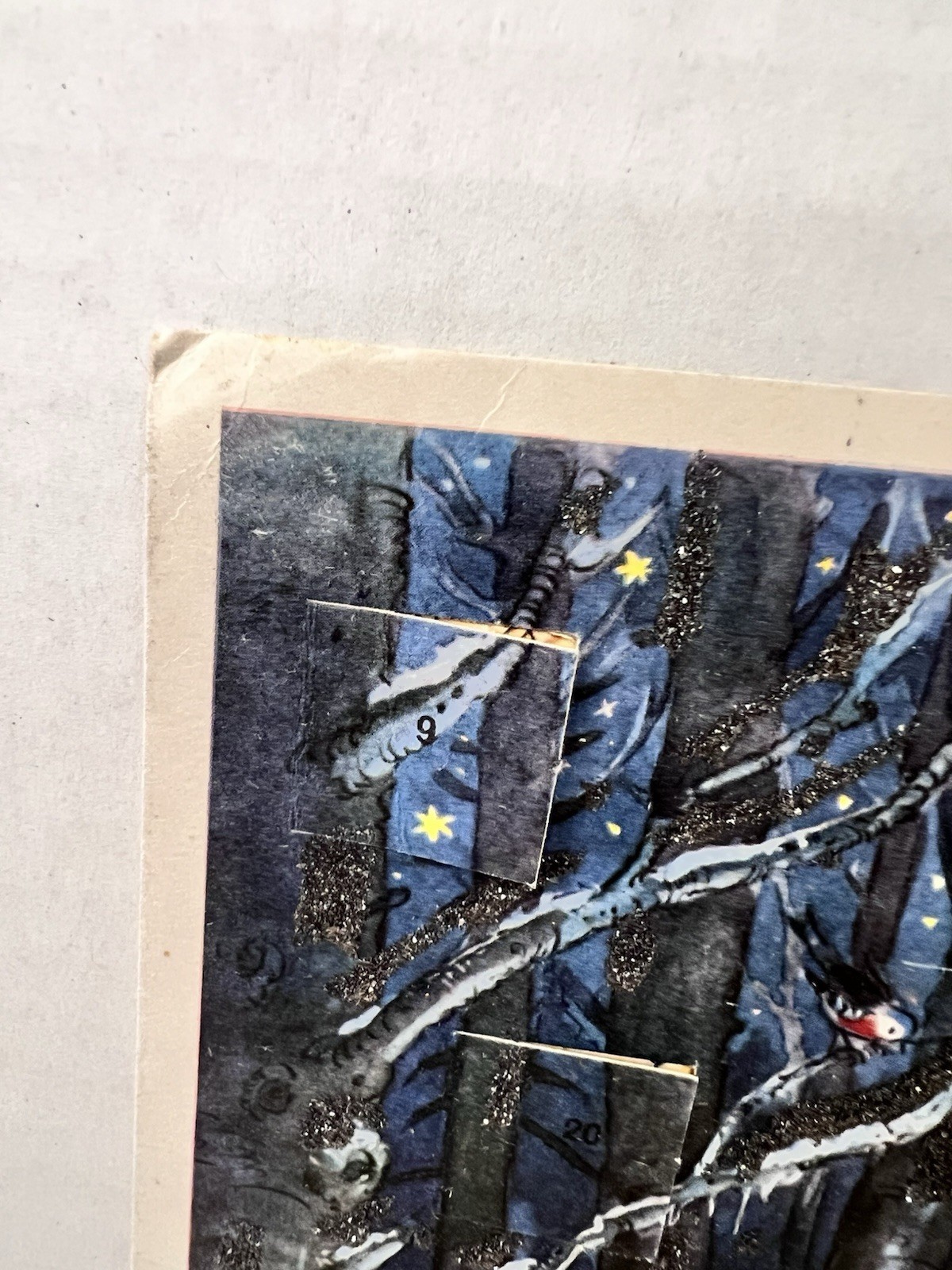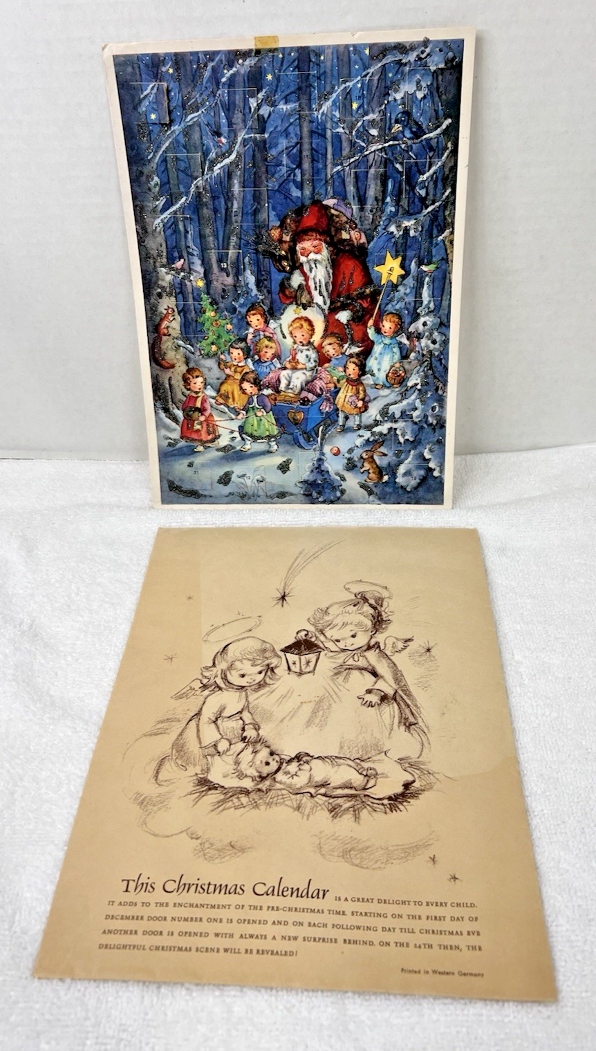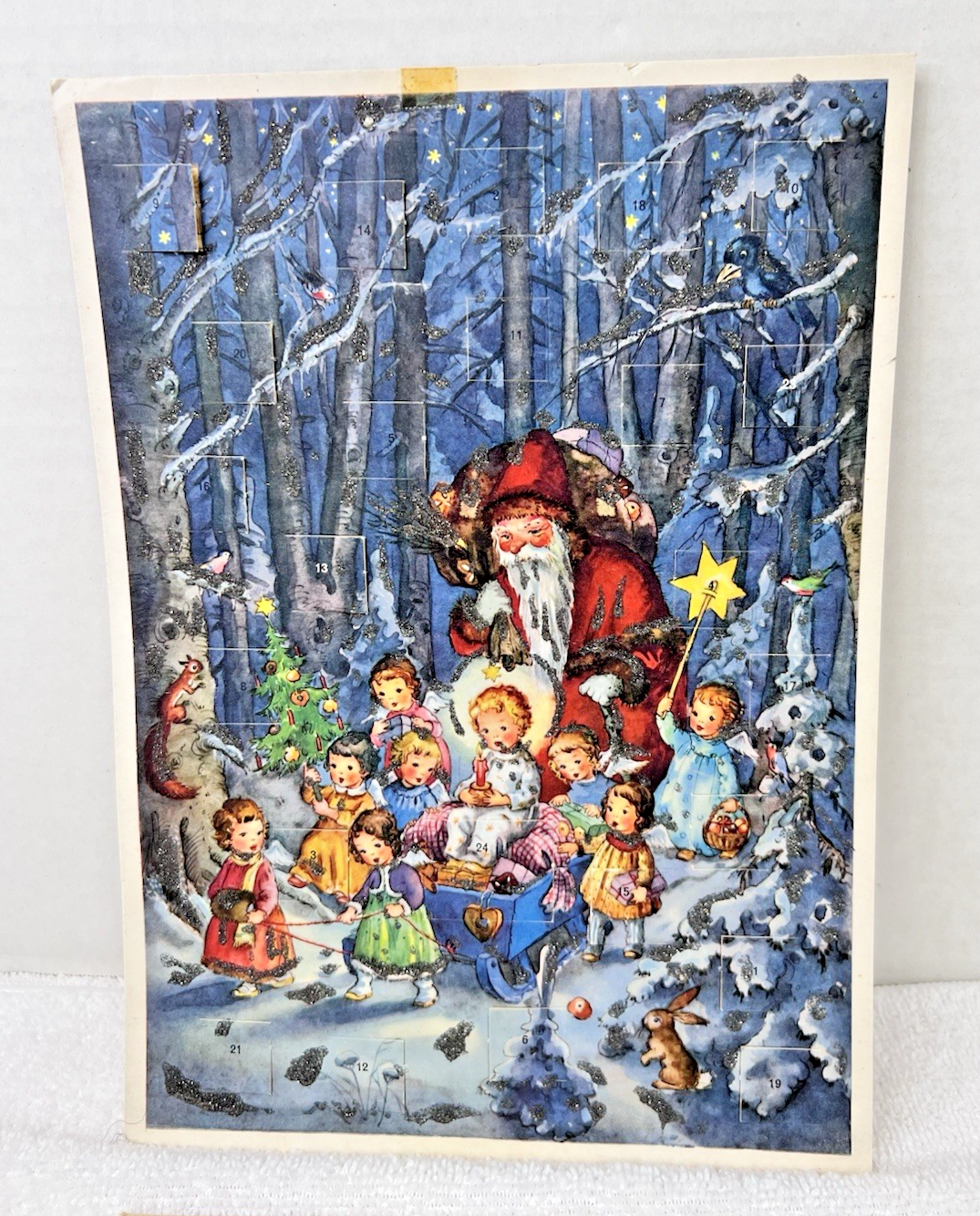 Vintage Kruger W Germany Christmas Advent Calendar Santa Children Sled Glitter ok one window has a small tear from the back, and it has tape on the top edge also a few small bumps and tiny tears at the edges, but the artwork is sweet and can be used. It measures 11 x 7 7/8 inches