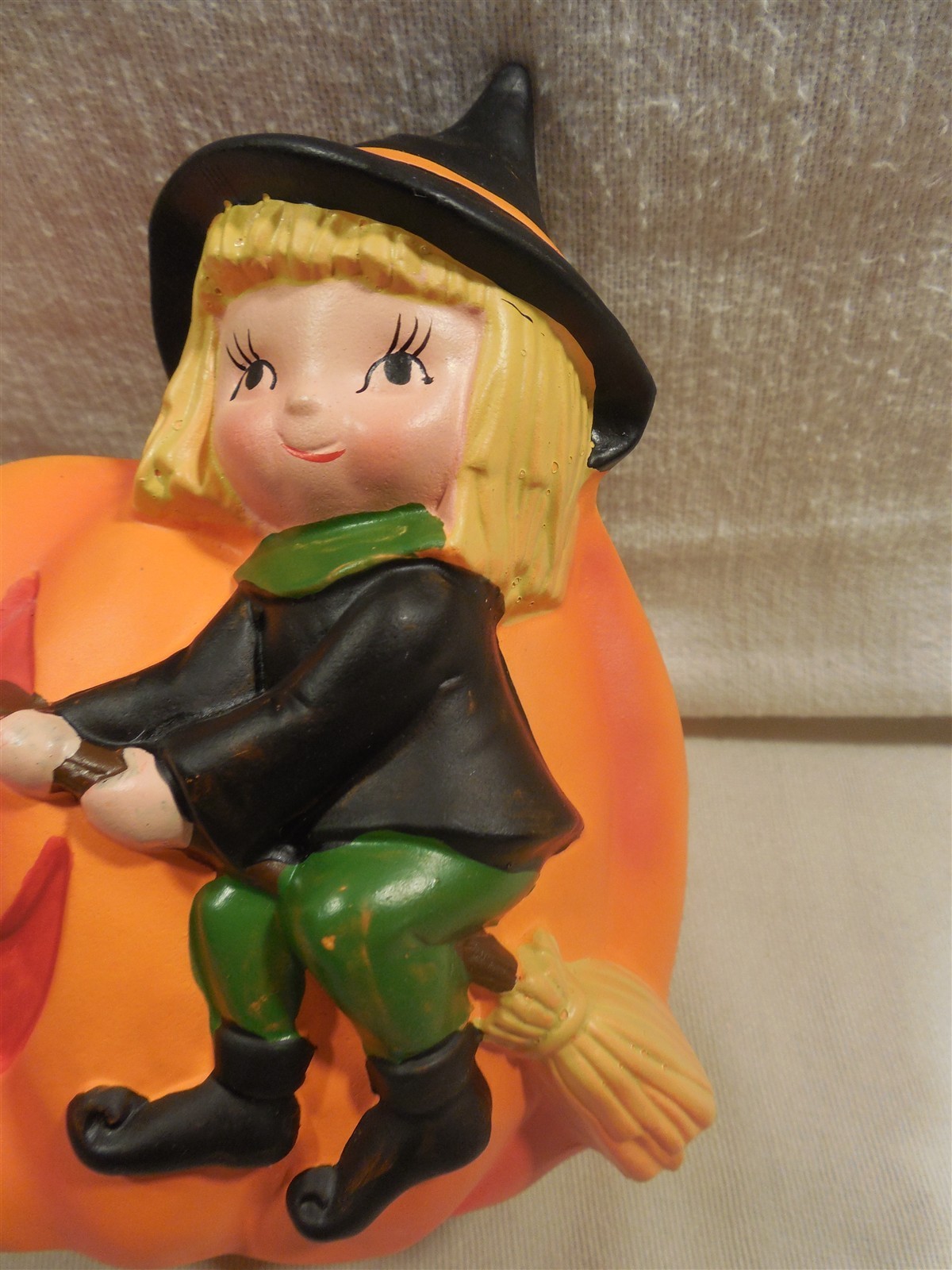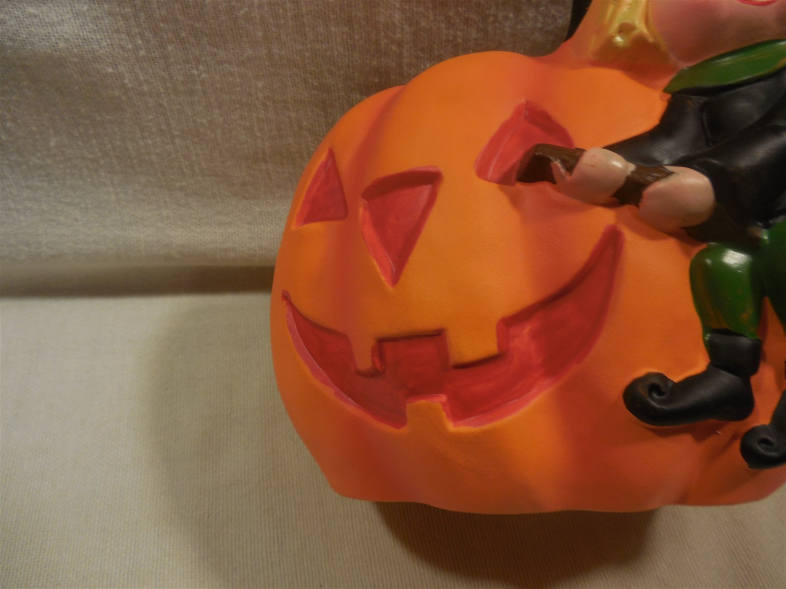 This is a vintage Napco Japan Ceramic Halloween Witch Jack-O-Lantern Pumpkin planter. The pumpkin has a great jack-o-lantern face with a cute witch riding a broom. The original red and gold foil Napco Japan label is attached to the bottom. The planter measures approximately 5 1/2" tall and 5 1/2" wide. Super clean cute Napco Japan ceramic Halloween witch jack-o-lantern pumpkin planter that displays absolutely great when sitting on a shelf!