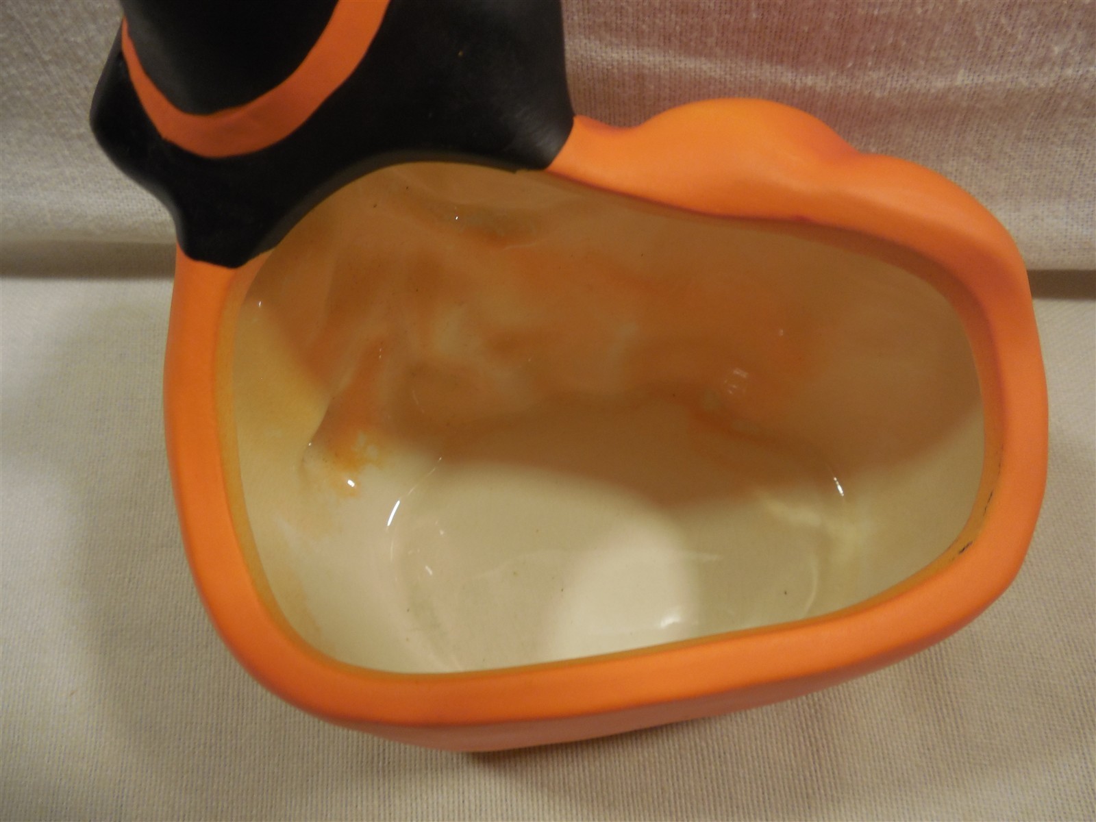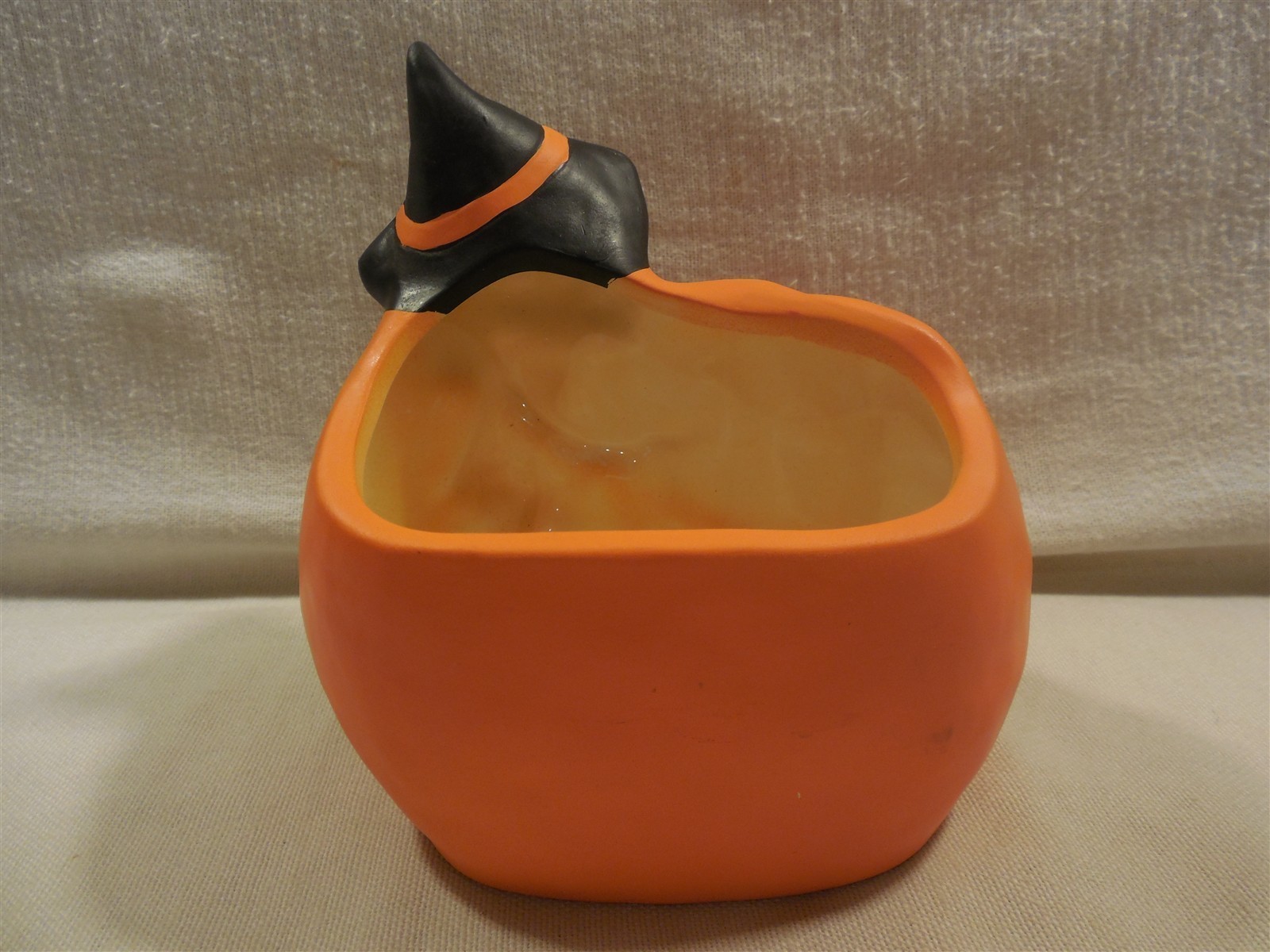Near Mint Napco Japan ceramic Halloween witch pumpkin planter has no chips, cracks, fading or stains. Paint colors are strong with very minimal wear - no glaze crazing is apparent. The original red and gold foil Napco Japan label is attached to the bottom. Super clean cute Napco ceramic Halloween witch jack-o-lantern pumpkin planter that displays absolutely great when sitting on a shelf!