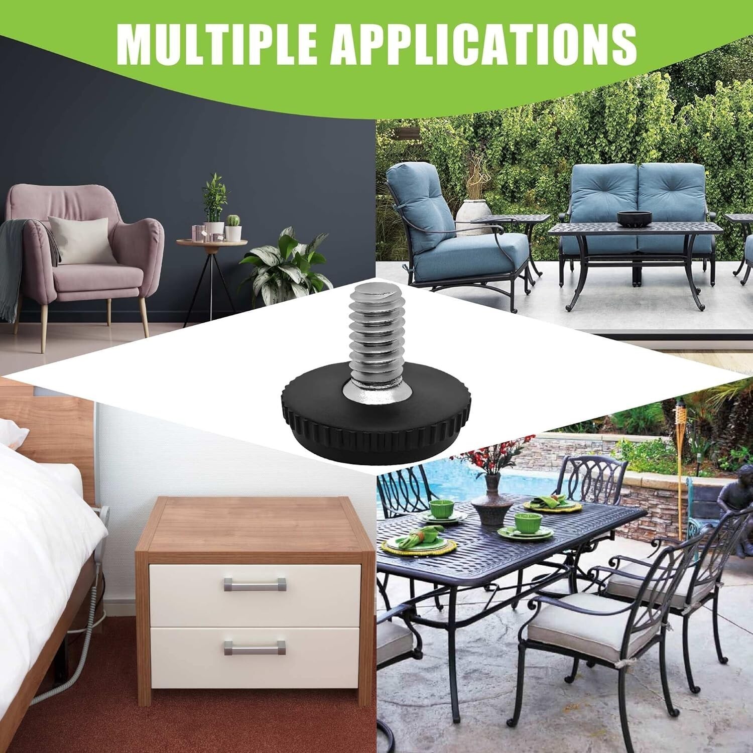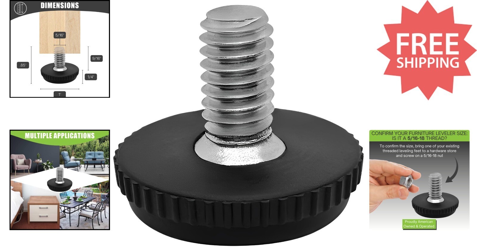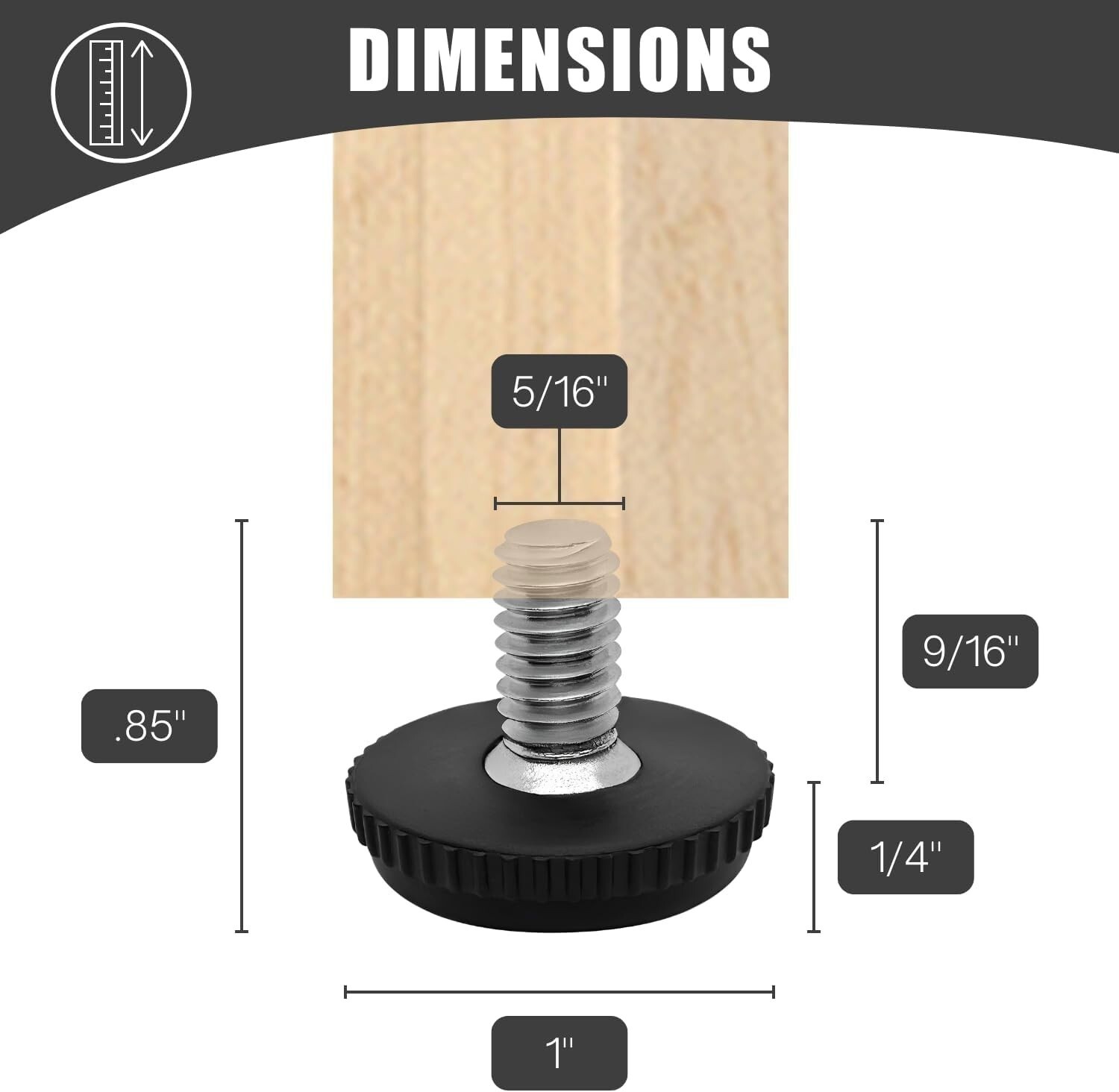 Enhance and protect your furniture with these versatile 5/16-18 adjustable furniture feet, compatible with most American brands. Crafted from durable stainless steel, they resist corrosion and rust better than galvanized steel options. Featuring a 5/16" diameter shaft, 18 threads per inch, and a 9/16" threaded stud length, these replacement glides have a 1" diameter non-marking nylon base that safeguards your floors. Ideal for tables, chairs, patio furniture, and appliances, they reduce friction and noise, facilitate easy movement, and can be adjusted for a wobble-free setup. To ensure the perfect fit, compare your current feet with a hardware store nut before ordering.