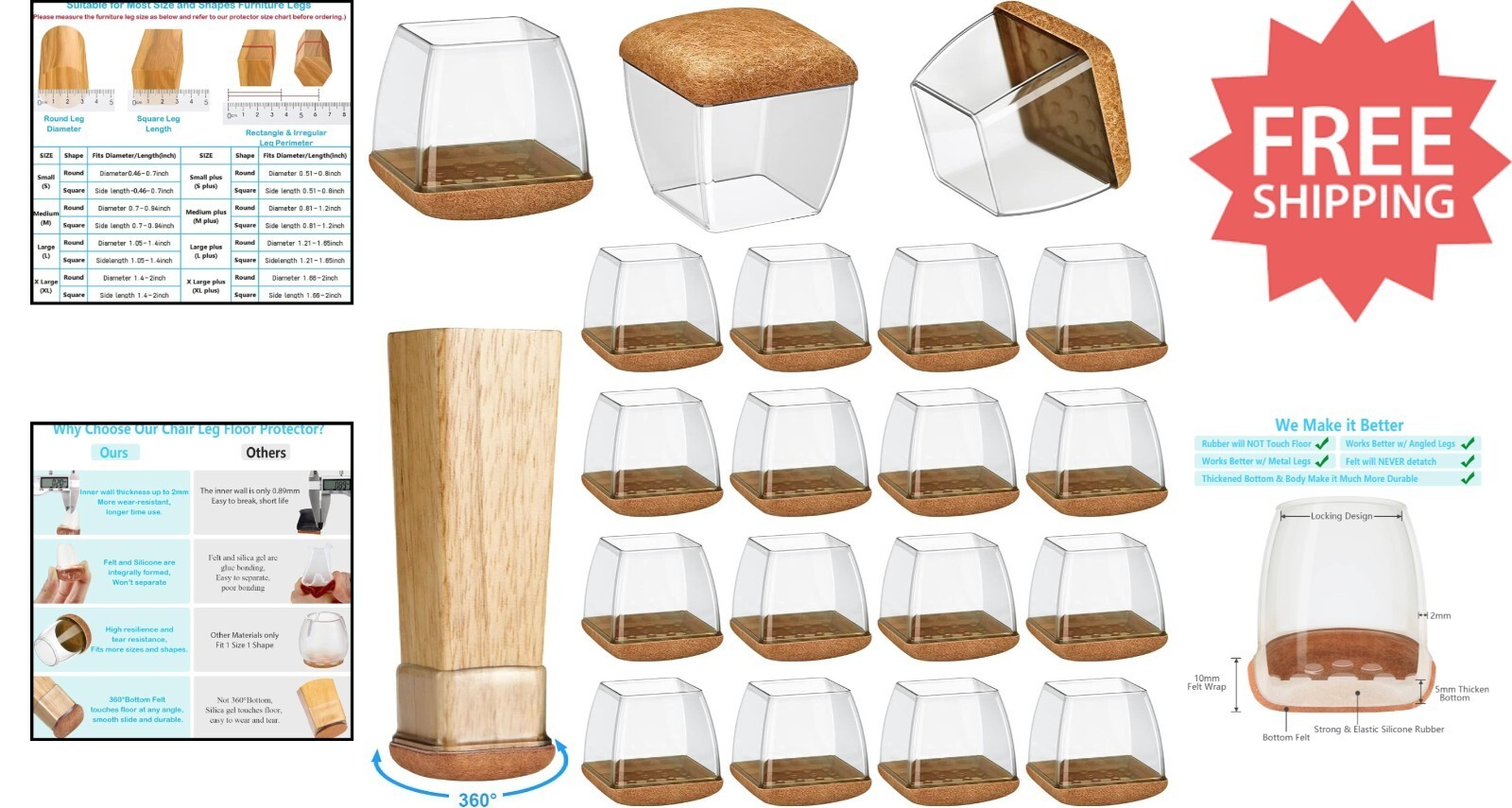 Upgrade your furniture care with our new design Furniture Leg Floor Protectors, crafted from thick silicone and featuring a 360 full felt pad for comprehensive floor protection. Available in multiple sizes (S, M, L, XL, and Plus variants) to fit a wide range of furniture legs, these protectors offer a snug fit with durable, stretchable rubber and anti-slip features. Easy to install, washable, reusable, and compatible with various flooring types including hardwood, tile, marble, and carpet, they eliminate noise, prevent scratches, and stabilize furniture. Perfect for chairs, tables, and more, to keep your floors pristine and your home peaceful. To ensure fast and reliable delivery, we work with multiple fulfillment partners and suppliers. Depending on availability and location, your order may ship from different warehouses or arrive in packaging that varies from item to item. Tracking details are typically provided shortly after shipment, and customer satisfaction remains our top priority. Please note that due to carrier policies and regional regulations, certain items may not be eligible for delivery to specific states or territories.