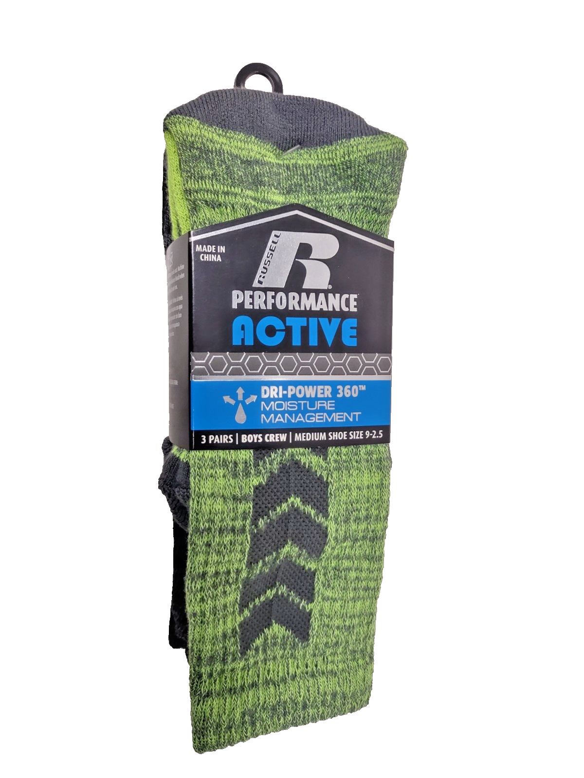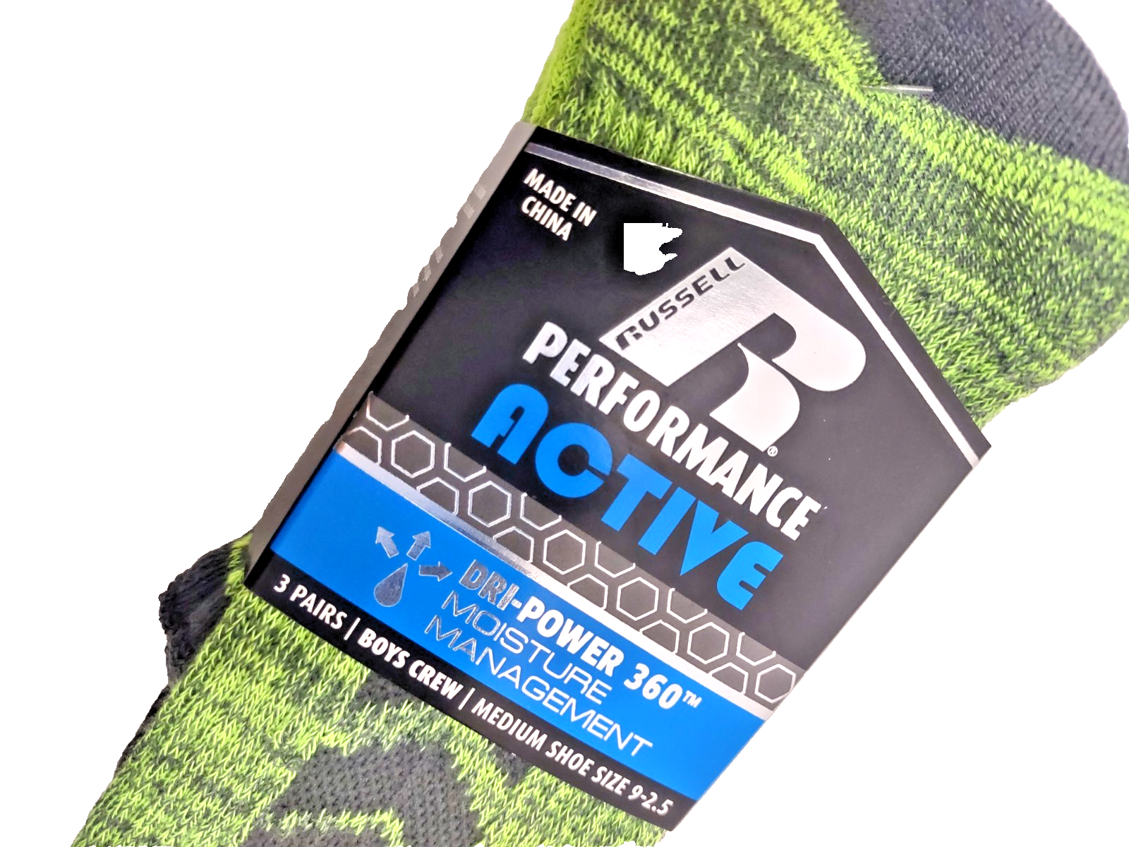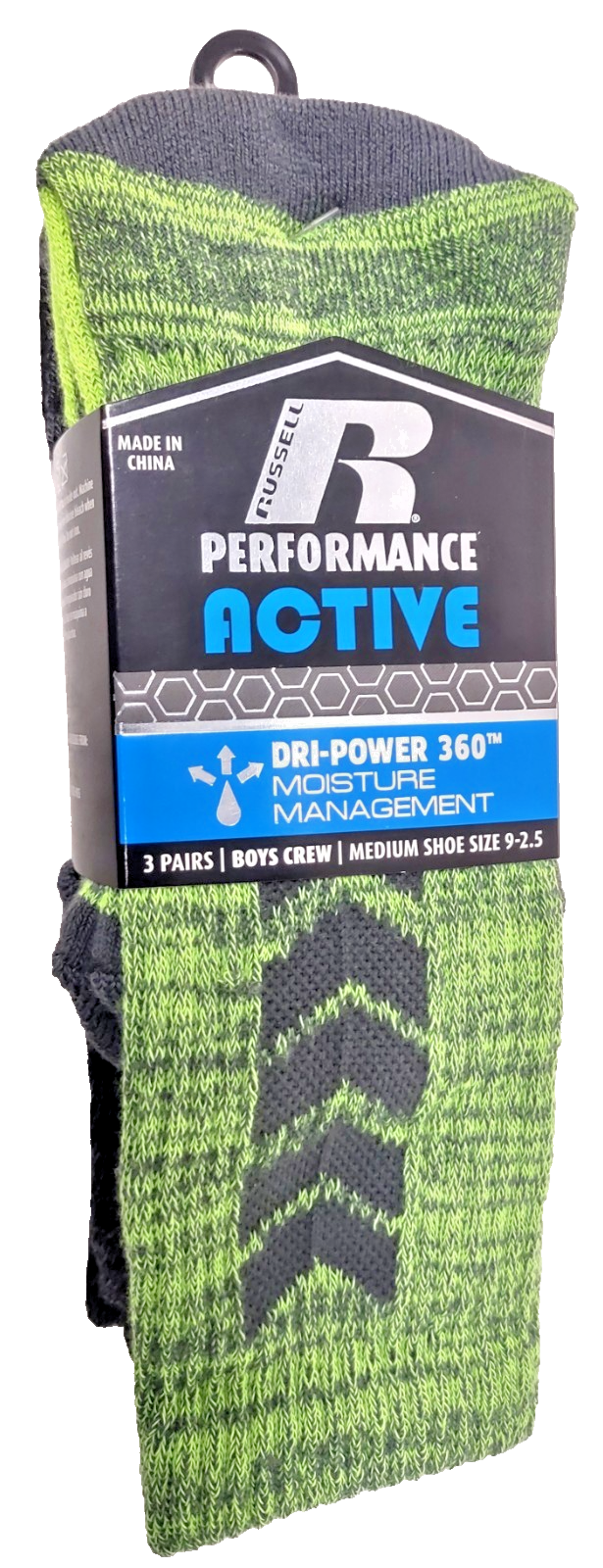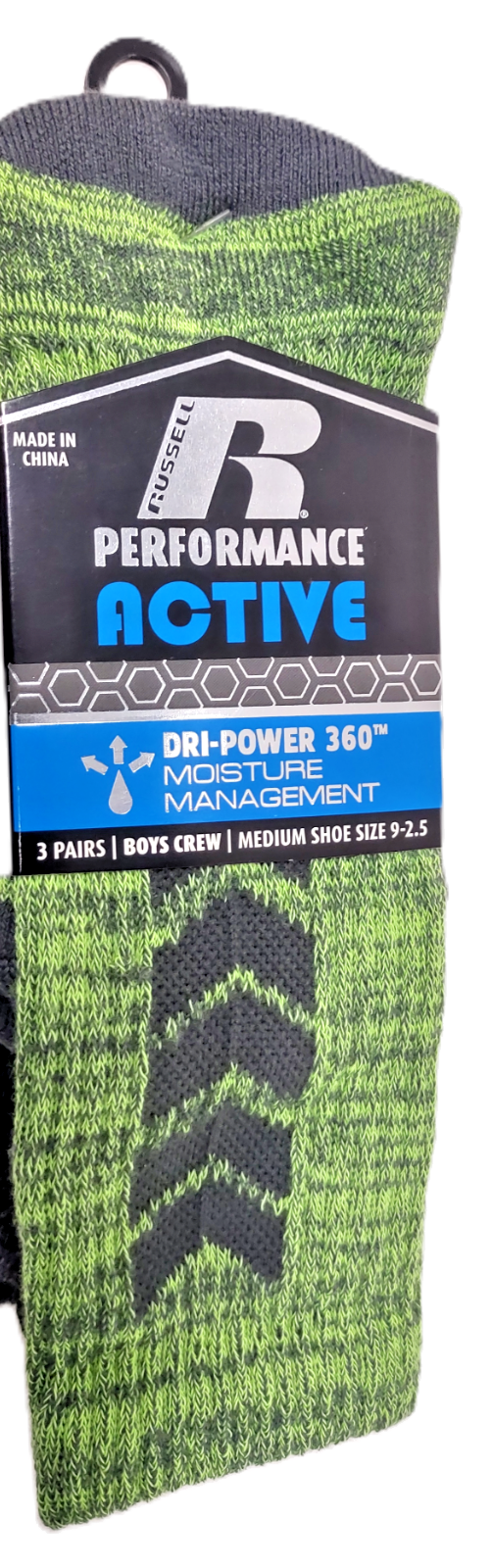 3Pairs Russell® Performance Active DRI-POWER 360 Boys Crew Socks M Shoe Sz 9-2.5