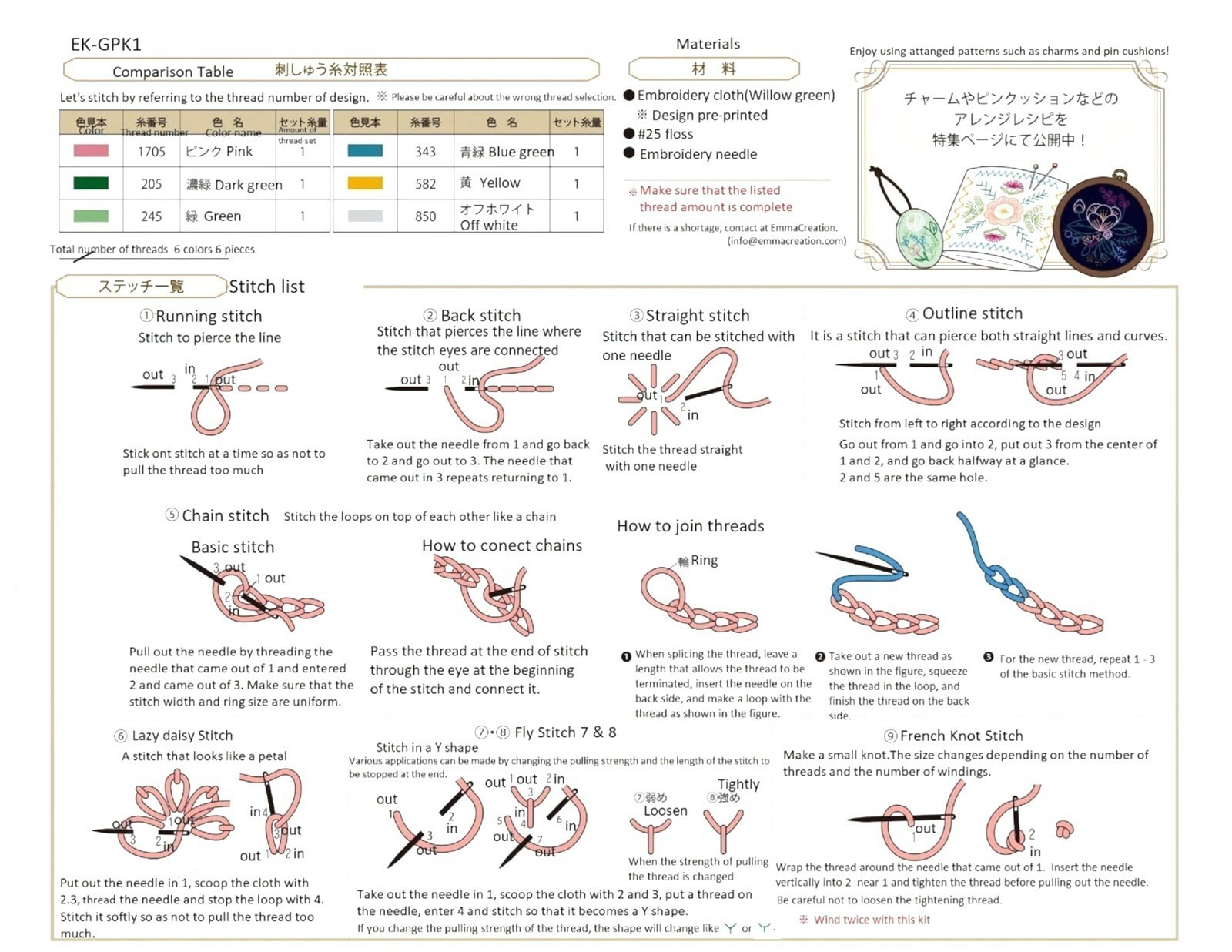 Olympus Garden Party First French Embroidery Kit Level 1 GPK-1. This embroidery stitch learning kit level one teaches you 9 basic stitches. It contains 100 percent cotton embroidery cloth in 13cm x 26cm with pre-printed patterns for practice, six colors of Cotton No 25 Embroidery floss, needle and instructions. Difficulty Level: Beginner. Estimated production time: 5 hours. Fabric Size (H x W): Approx. 5.1 x 10.2 inches (13 x 26 cm). Item Number: GPK-1. CHK-EK-GPK1