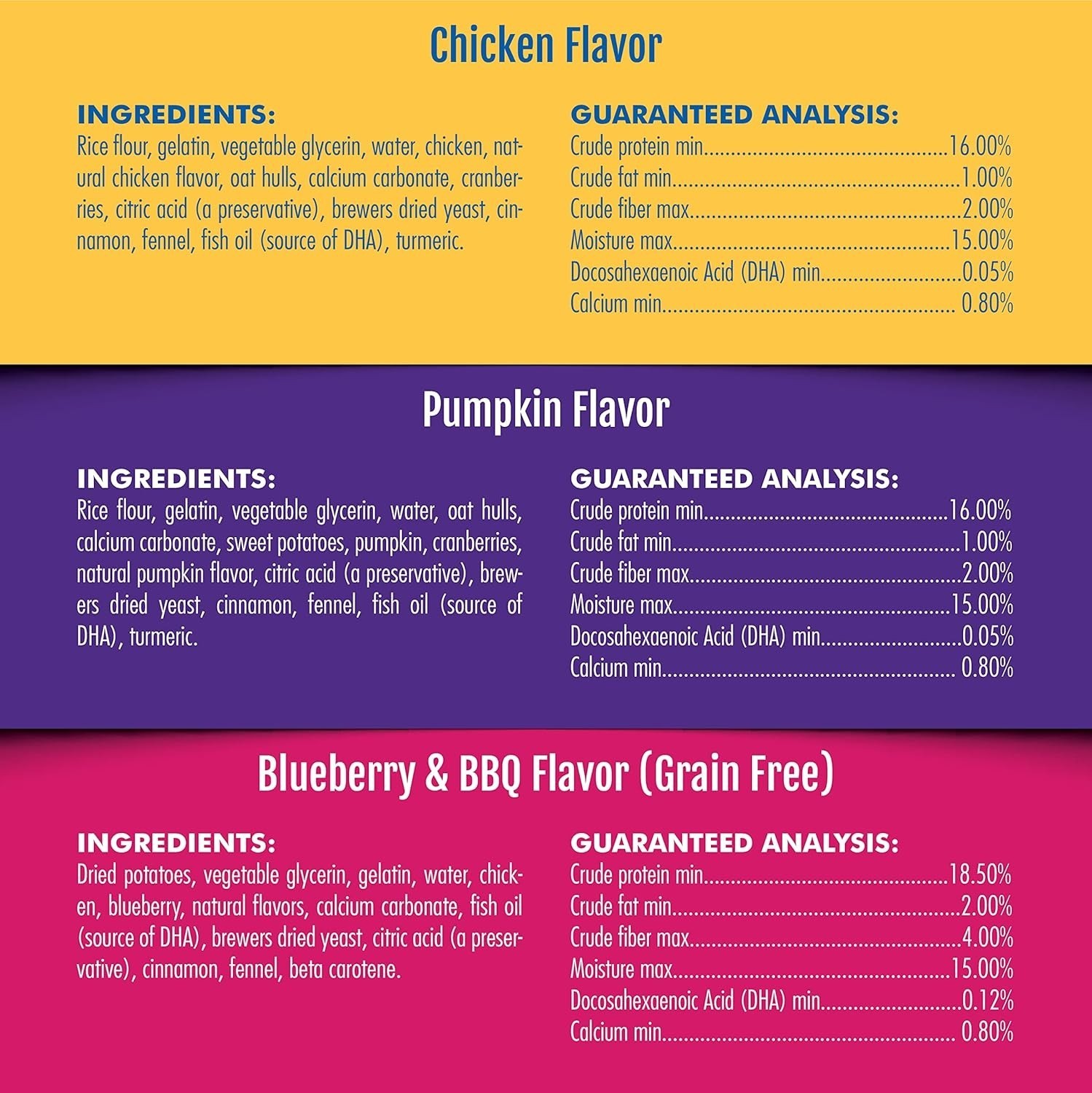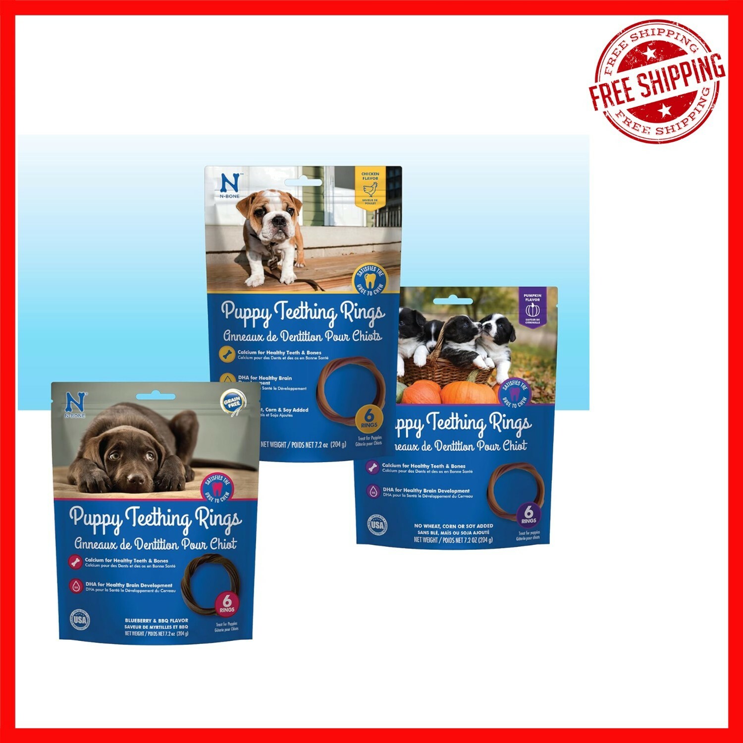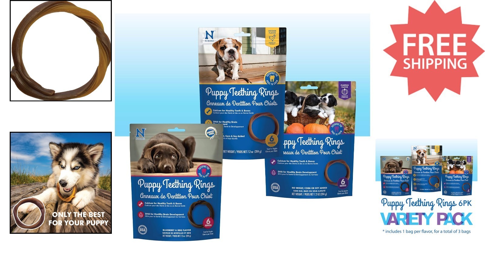 Enjoy a variety pack of three delicious flavors: Chicken, Pumpkin, and Blueberry BBQ, perfect for your puppy to explore and enjoy! These ring-shaped treats are specially designed to ease sore gums and teething discomfort through gentle massaging action. Made in the USA with a palatable, safe, and digestible formula, they help satisfy your puppy's natural need to chew while promoting healthy dental development. Crafted for puppies of any breed, these pliable chews support oral health without damaging immature teeth, offering a beneficial and tasty outlet for your young dog's chewing instincts.