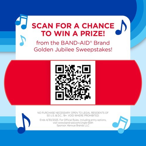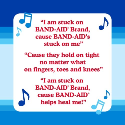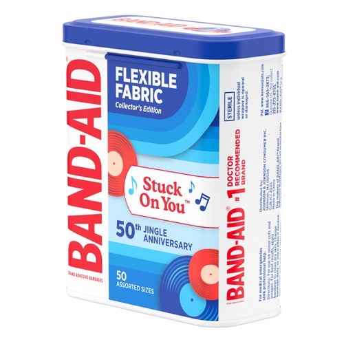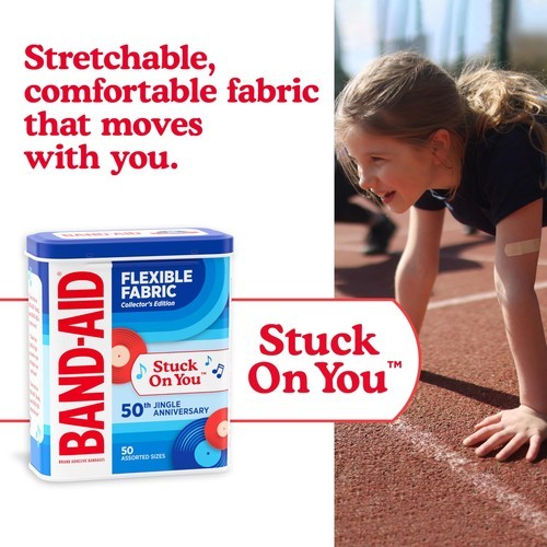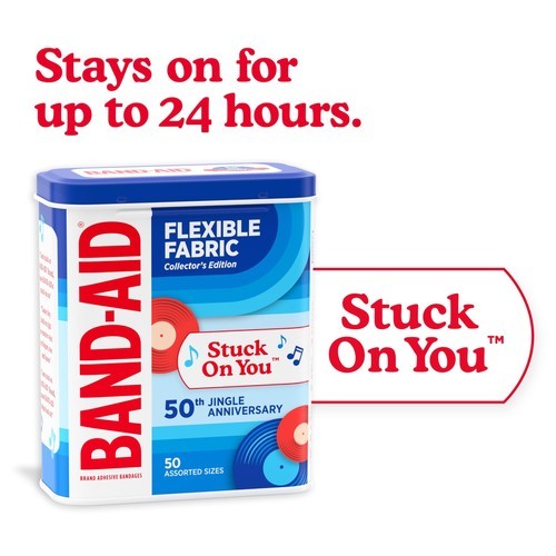Help care for minor wounds, cuts, scrapes, burns with BAND-AID Brand Adhesive Bandages Flexible Fabric, Jingle Anniversary Tin edition. 50 years ago, the iconic BAND-AID Brand "Stuck on You" Jingle made its television debut. Since 1975, the award-winning catchy tune remains one of the most recognizable jingles in history. These flexible bandages help protect against dirt germs that may cause infection are made with Memory Weave fabric for comfort. They feature a unique Hurt-Free Pad that won't stick to the wound as they wick away blood fluids, allowing for gentle, pain-free removal. To use, apply the flexible adhesive bandage to clean, dry skin for minor wound care change daily, when wet or as needed. For proper care, treat the wound with an antibiotic ointment such as Neosporin prior to application. This pack of fabric bandages in various sizes is the ideal addition to wound care supplies first aid kits.