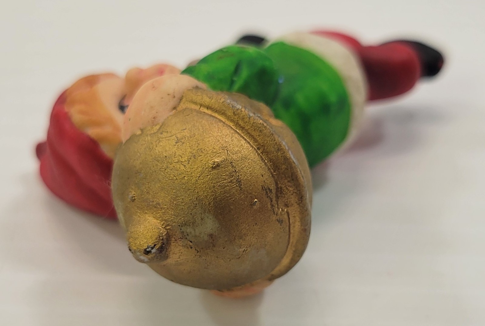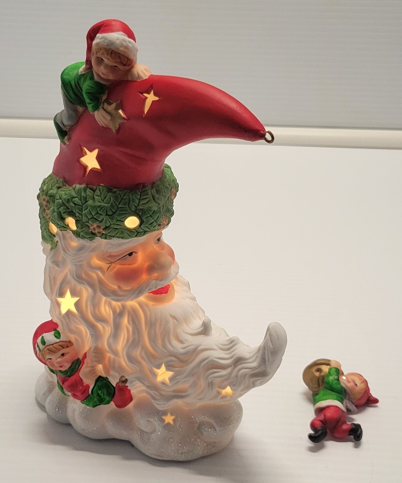 Decoration has some flaws. The hoop on the hanging elf ornament has broken off and therefore cannot be hung. It will require a creative repair. The tip of Santa's hat has a slight crack when examined closely but does not affect it's display or use. Inner bulb would get loose while in storage and may possibly need to be tightened in place after shipping as well. No other visible chips or cracks. Box shows signs of age with seasonal use and storage.