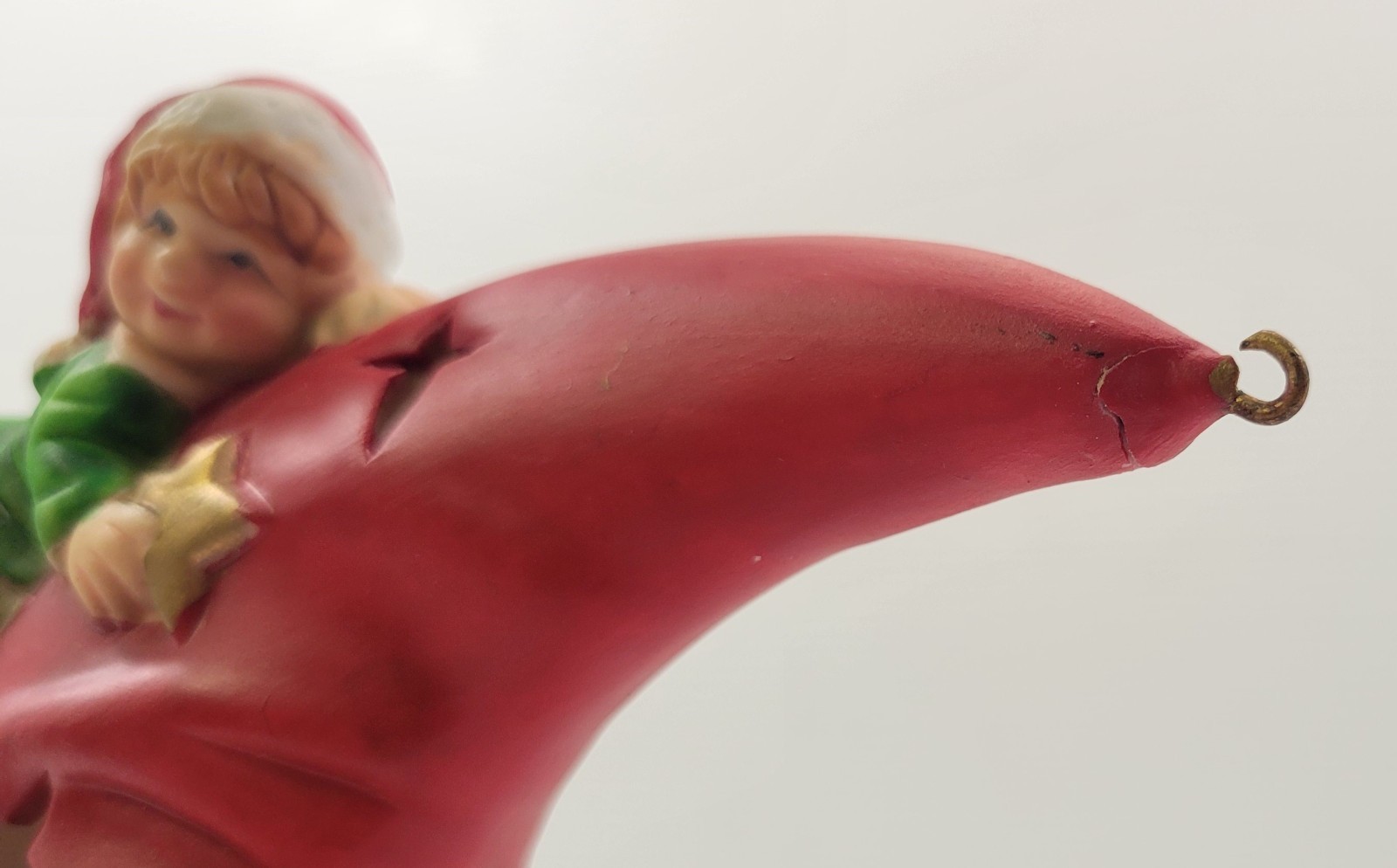 The hoop on the hanging elf ornament has broken off and therefore cannot be hung. It will require a creative repair. The tip of Santa's hat has a slight crack when examined closely but does not affect it's display or use. Inner bulb would get loose while in storage and may possibly need to be tightened in place after shipping as well. No other visible chips or cracks.