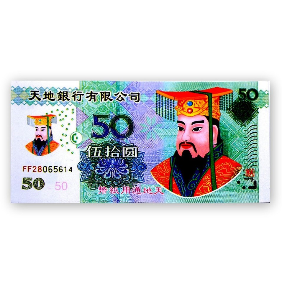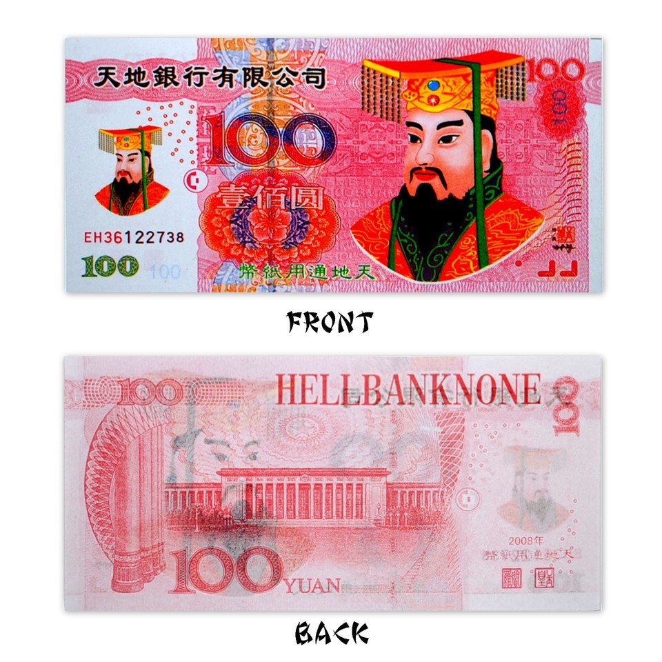 These unique bank notes are a special type of joss paper that is traditionally burned in Chinese ceremonies and feng shui rituals. They are commonly burned as offerings and monetary distraction for the 'Hell Gods' during 'Ghost Festival' observations and also ritually burned as offerings for the deceased.