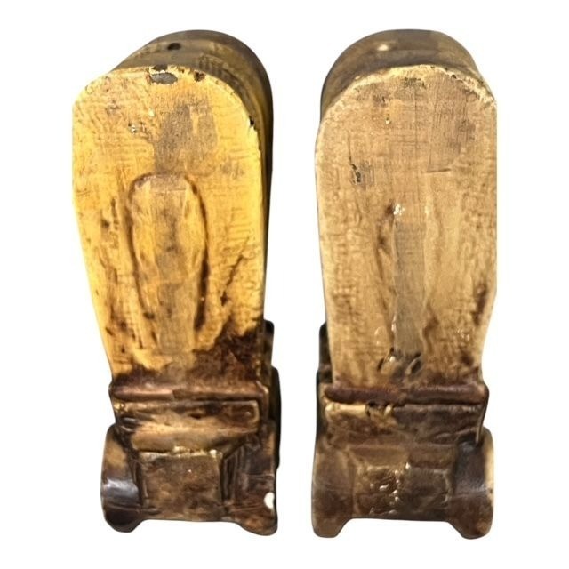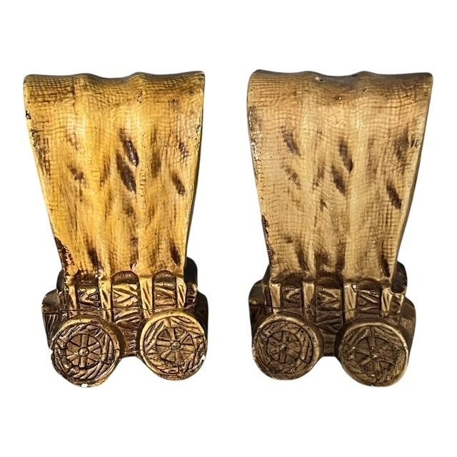 Pair of vintage ceramic salt and pepper shakers shaped like old-fashioned covered wagons. Each piece is hand-painted with a tan ?canvas? top, red lantern detail, and wagon wheel accents, labeled ?SALT? and ?PEPPER.? A fun nostalgic addition to any Western-themed kitchen or vintage collection.