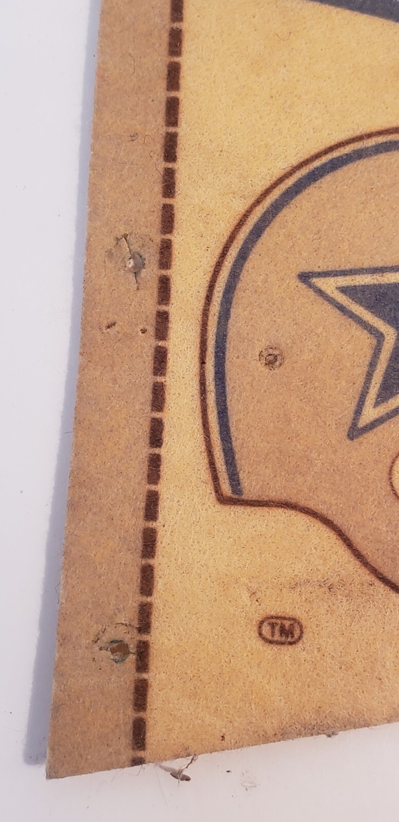The vintage mini pennant features the iconic NFL team, the Dallas Cowboys, measuring 9 inches by 4 inches. This collectible item showcases the team's historical charm, making it a perfect addition to any sports memorabilia collection. Perfect for fans of the Dallas Cowboys looking to display their team pride in a unique and nostalgic way. Pennant shows age with some discoloration and also has a few pinholes - please see pictures for further information