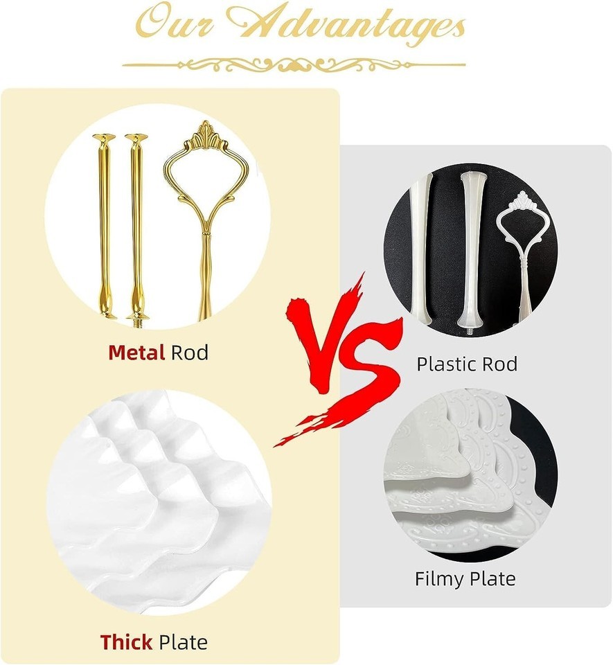 ?Our Advantages?:Compared with other ordinary plastic plates and rods, this cupcake stand is equipped with superior thicker tiered trays with food grade well polished metal rods, providing unparalleled texture and stability