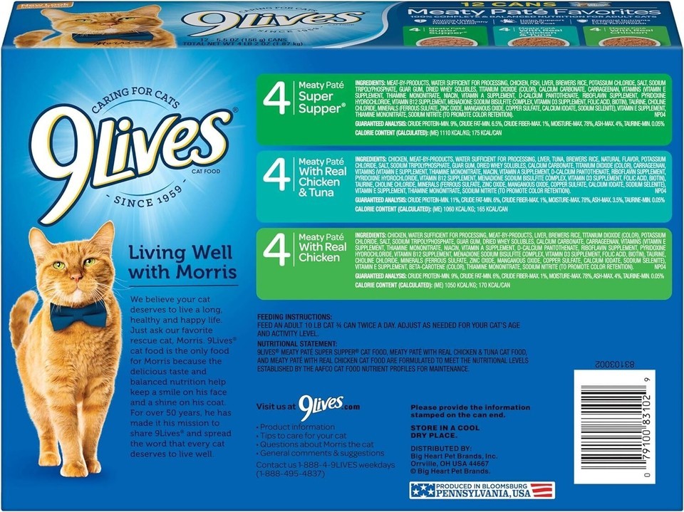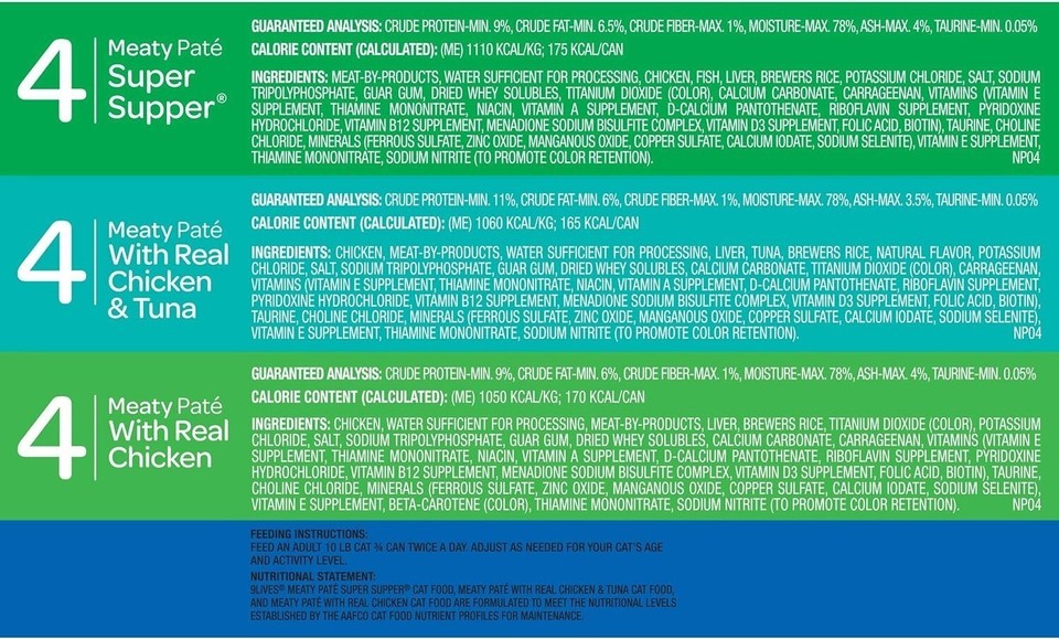 Contains twelve (12) 5.5 oz. cans of 9Lives Meaty Pate Favorites Wet Cat Food: four (4) 5.5 oz. cans of Meaty Pate Super Supper; four (4) 5.5 oz. cans of Meaty Pate With Real Chicken Tuna; and four (4) 5.5 oz. cans of Meaty Pate With Real Chicken