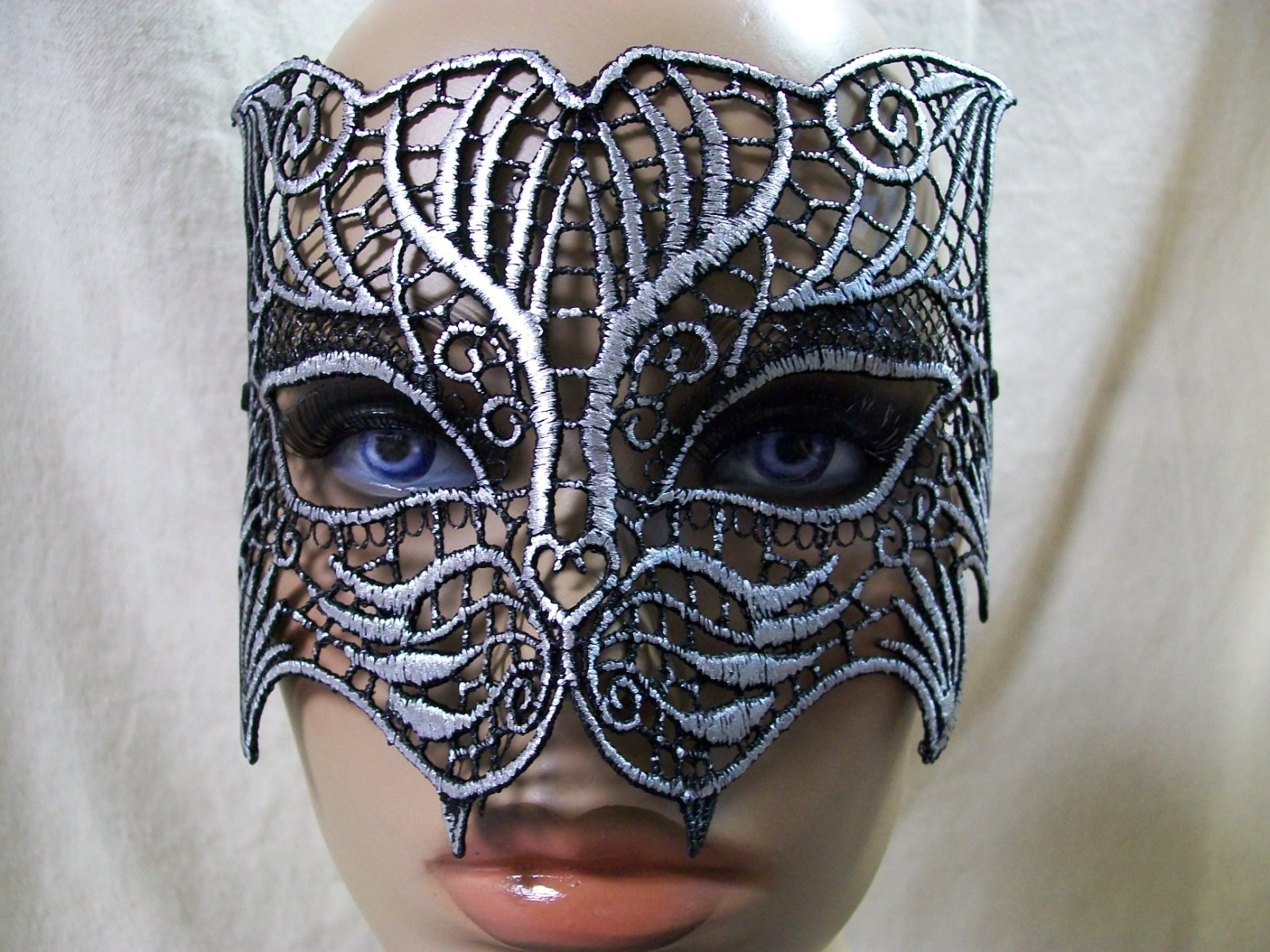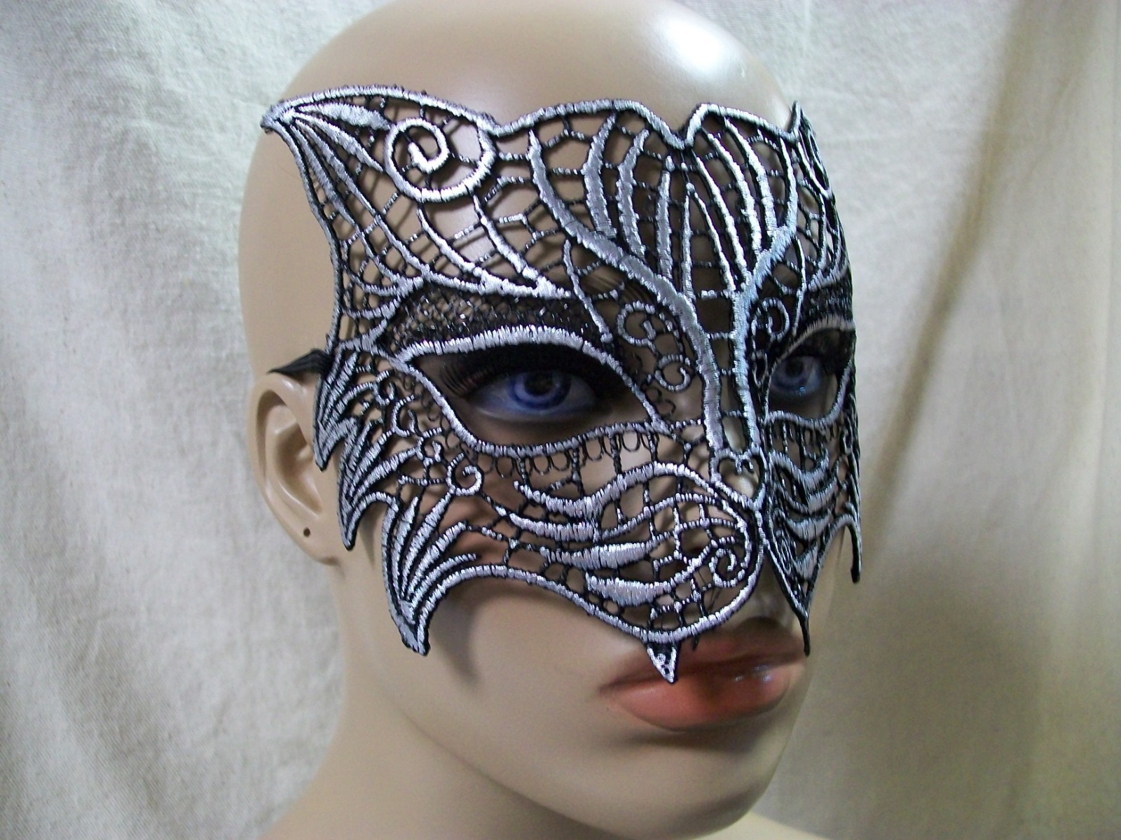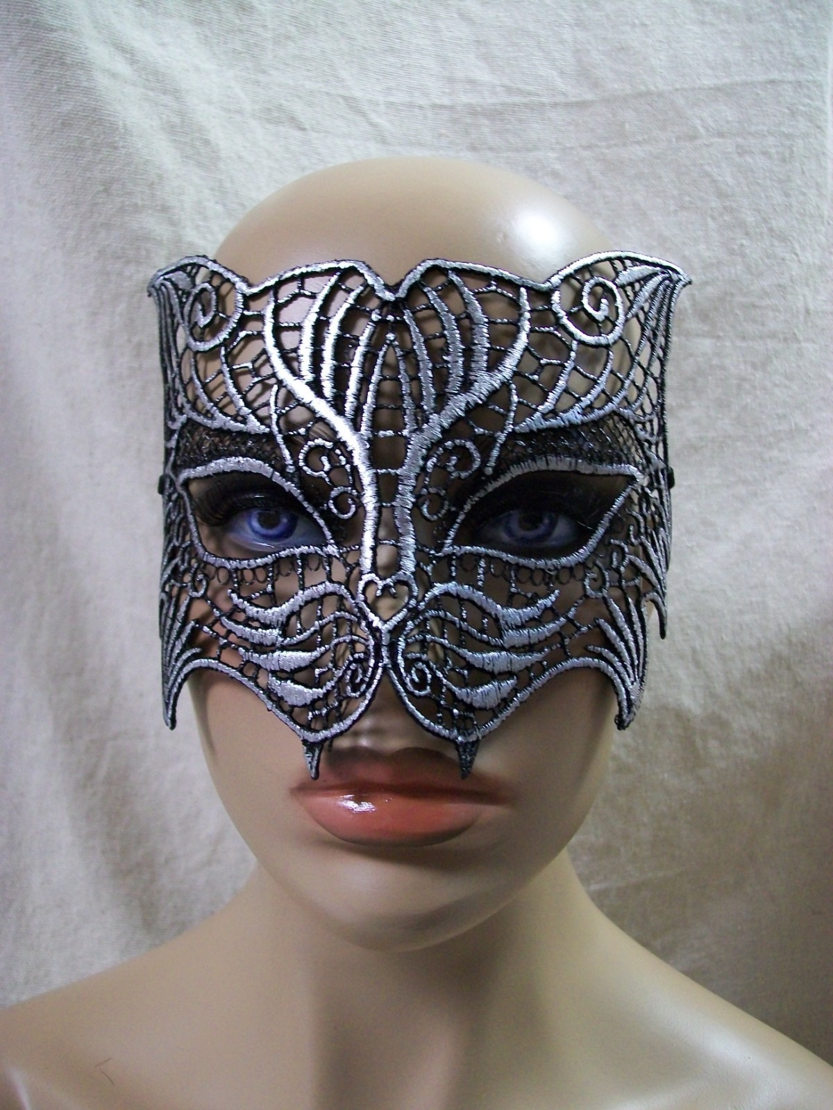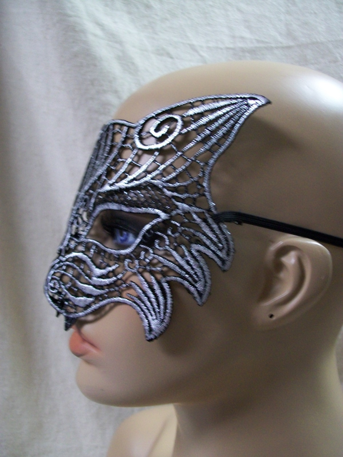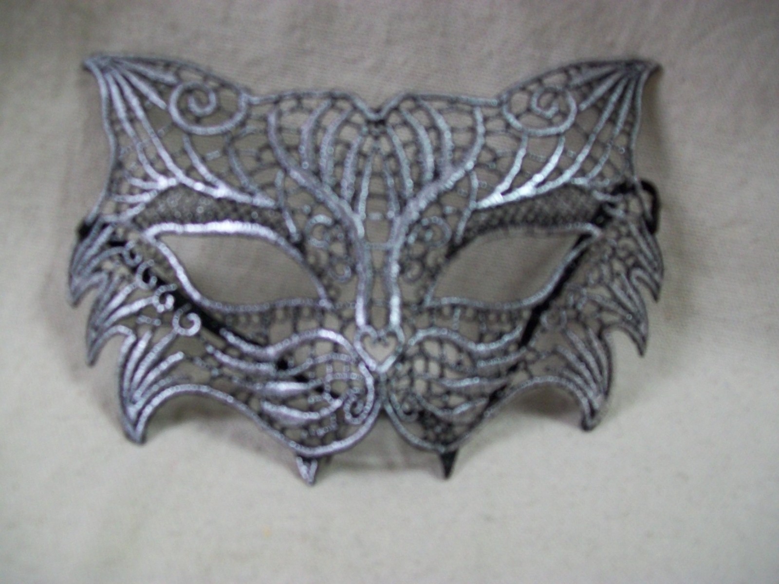 Filigree Stiff Lace like Venetian or Masquerade Costume eye mask. Has elastic strap. Covers only eye area of the face. This type of mask is great for parties because it is easy to wear while talking, eating, or drinking. One Size Fits Most. No Tags. No age specs, most costume items are for ages 14 and up.
