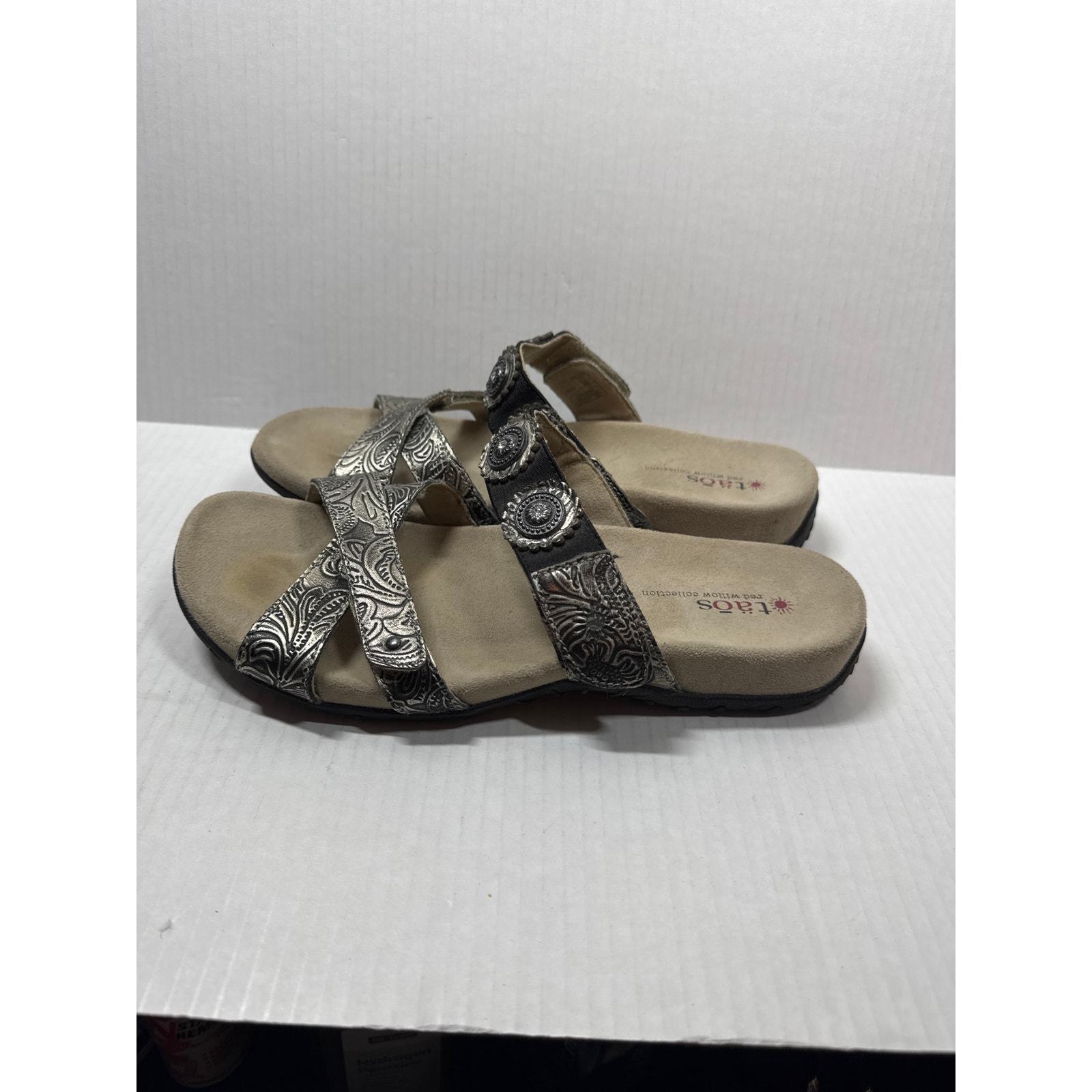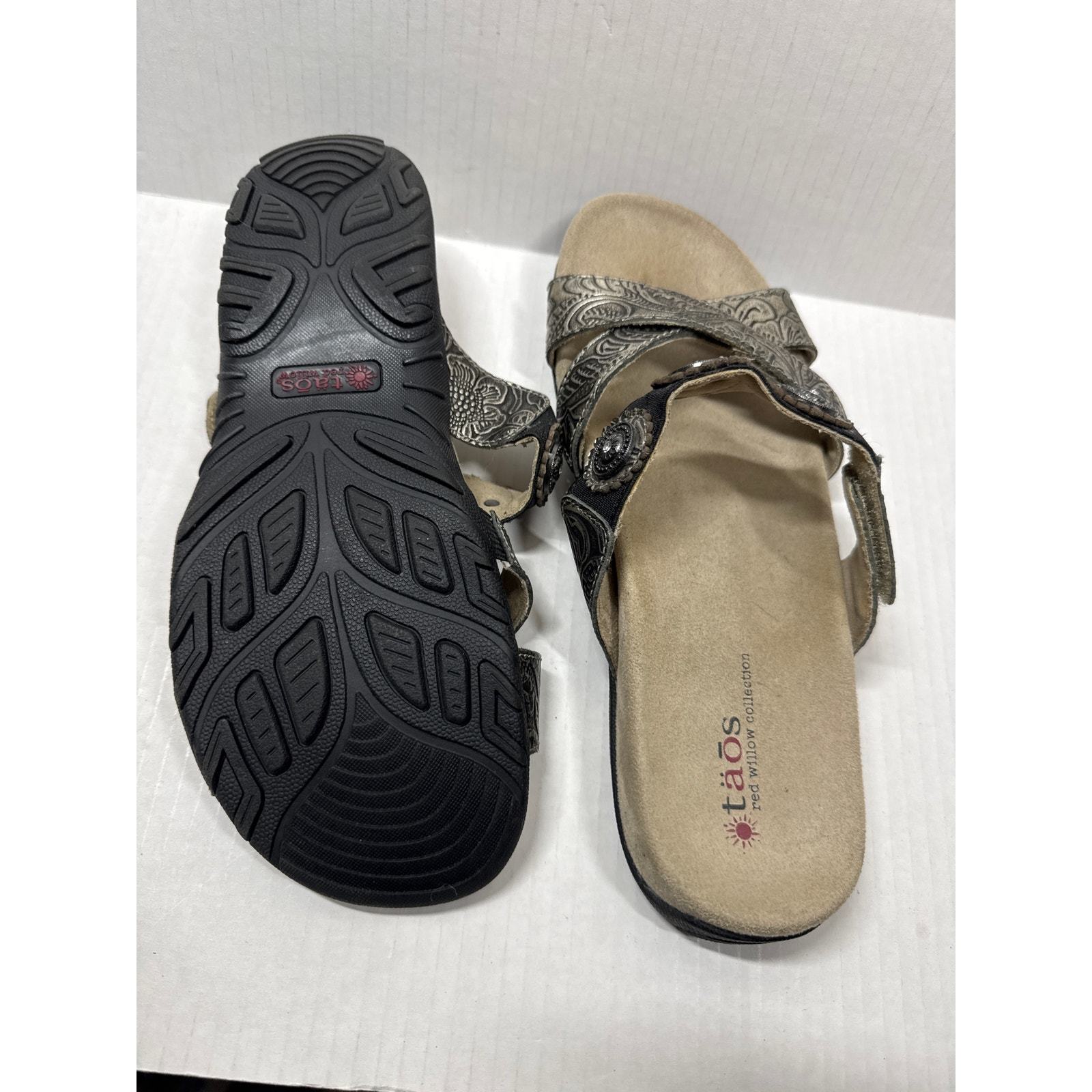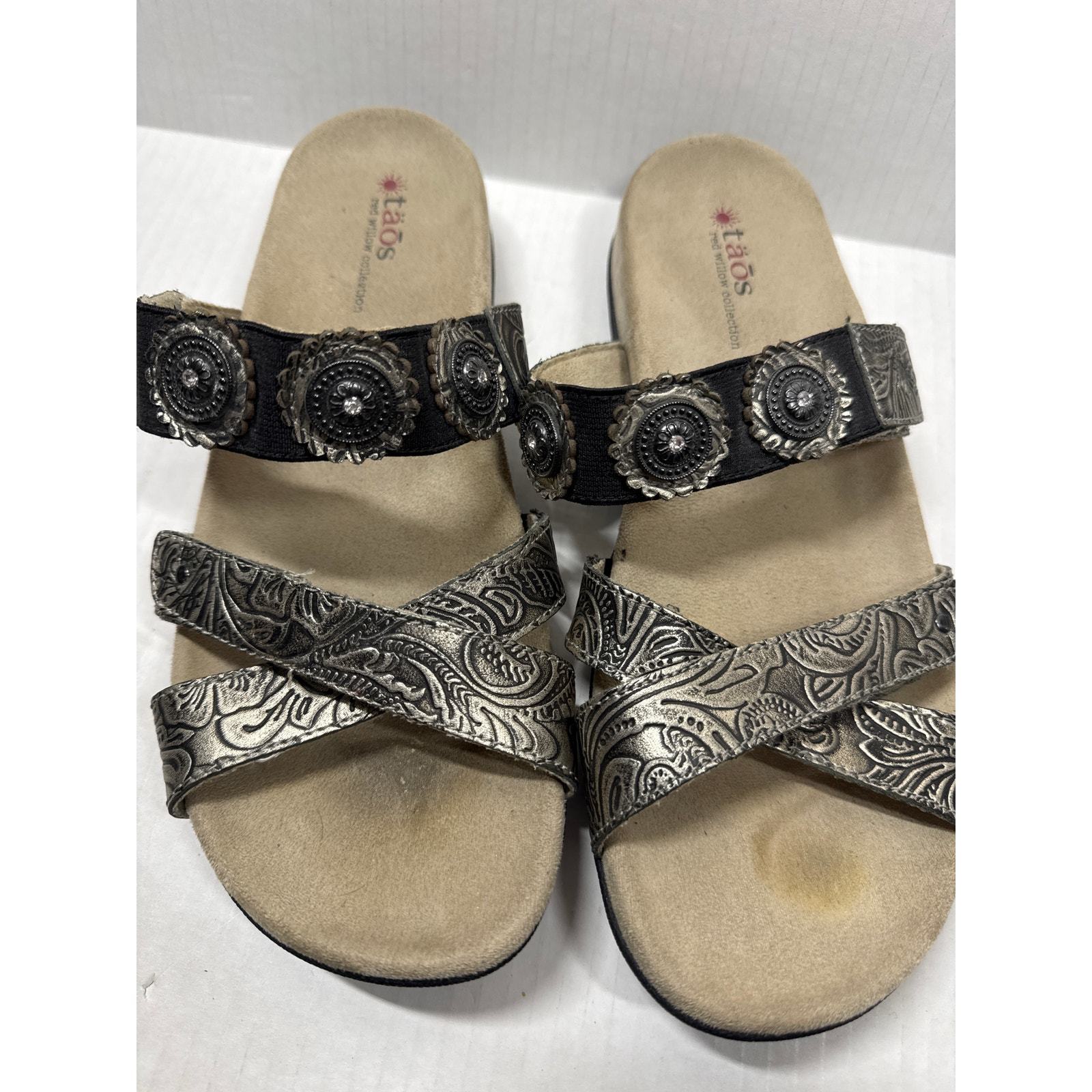Taos Sandals Womens Slide Pewter Leather Slip-On Medallion Size 9