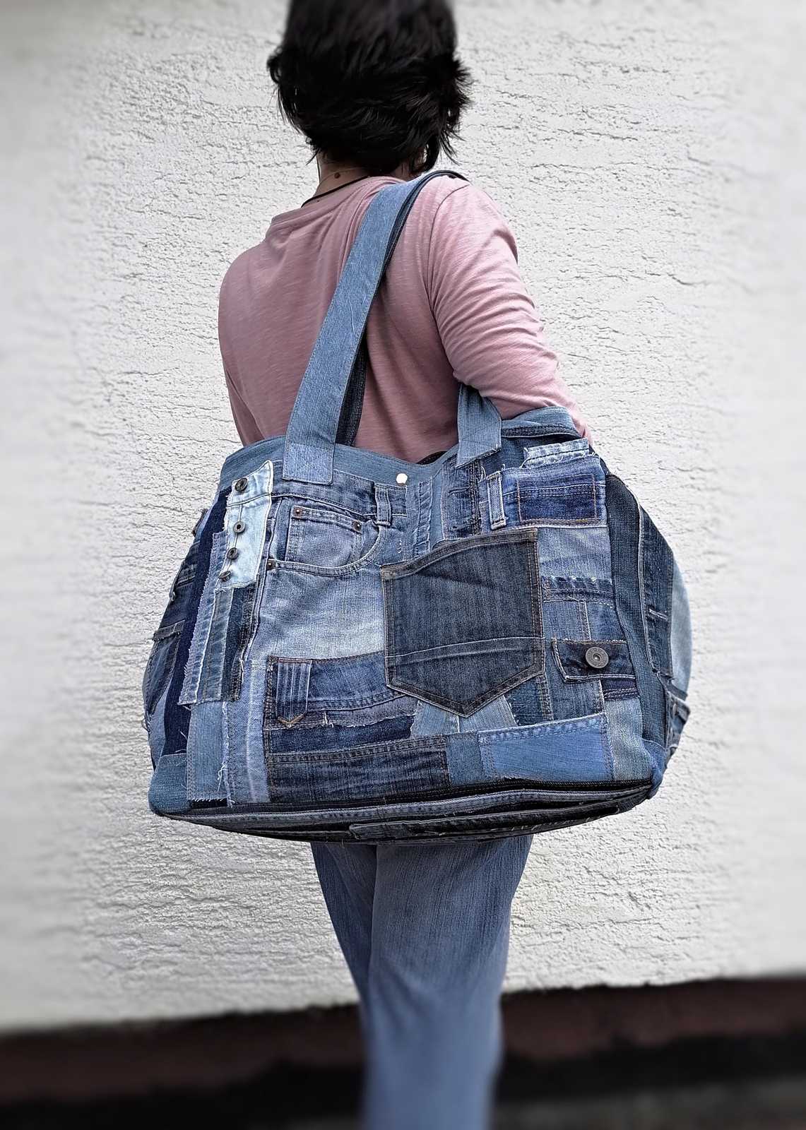 Oversized Patchwork Denim Tote Bag: Upcycled Jeans Travel Beach Bag