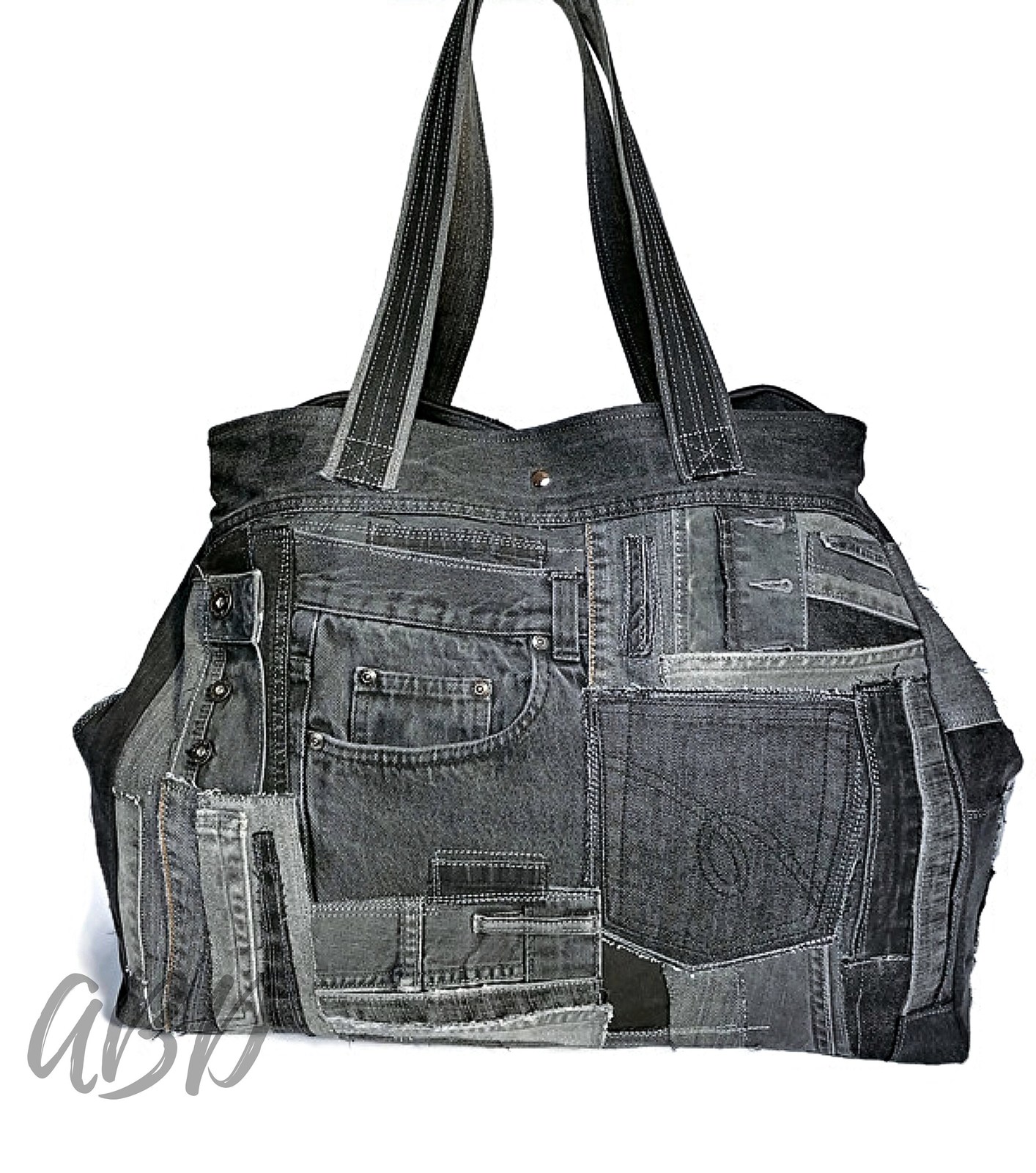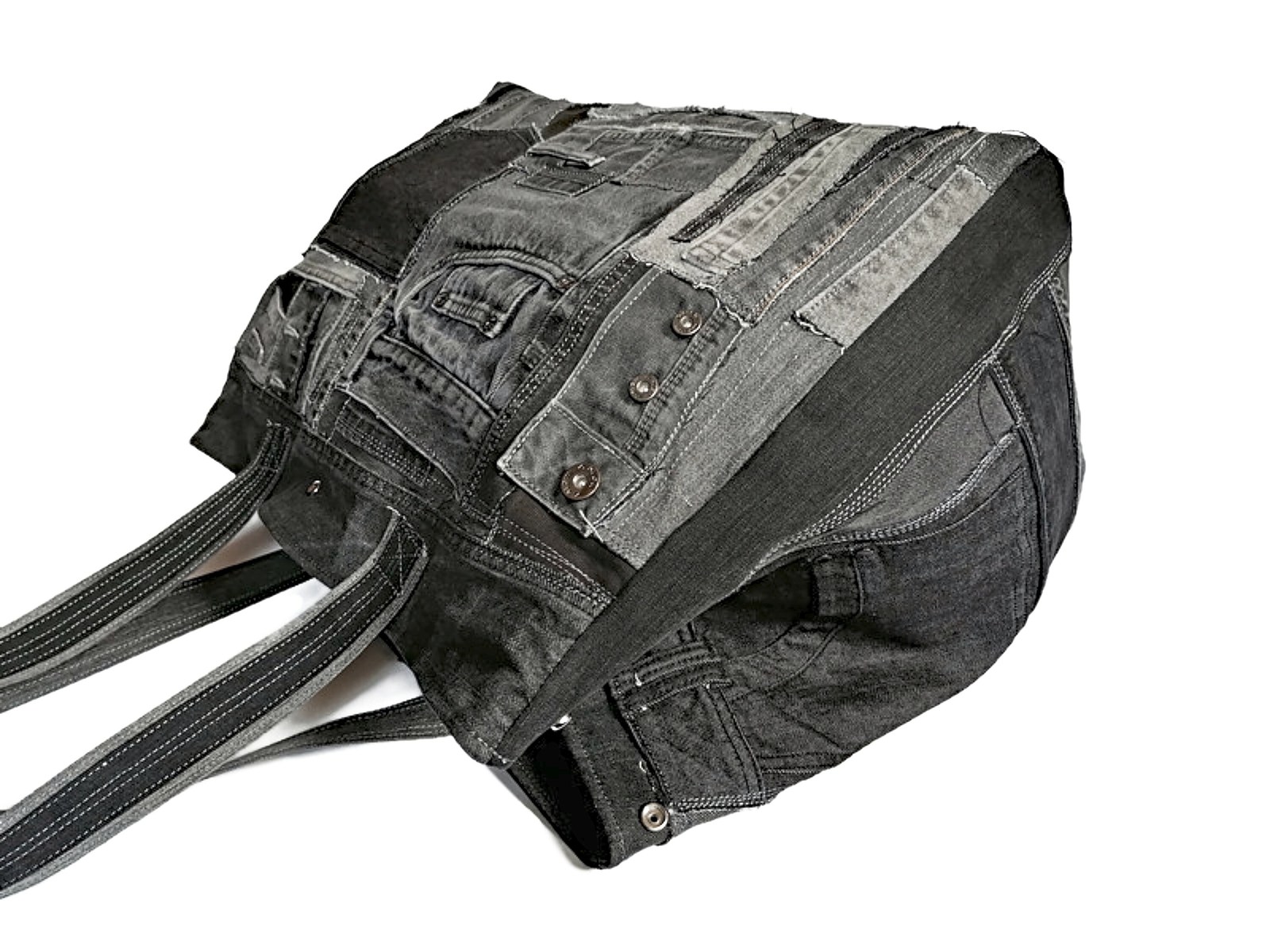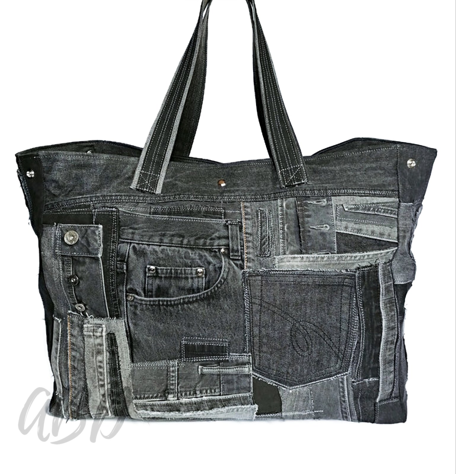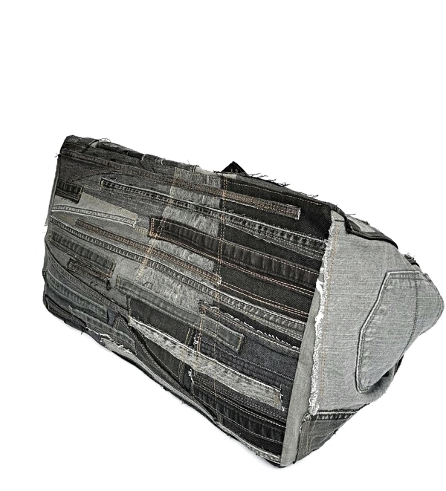 This Oversized Jeans Bag in a sleek black and gray patchwork is the perfect blend of practicality and bold, upcycled style. Made from carefully selected pieces of recycled denim, this extra-large tote is ideal for travel, weekend getaways, shopping, or daily use when you need more space.