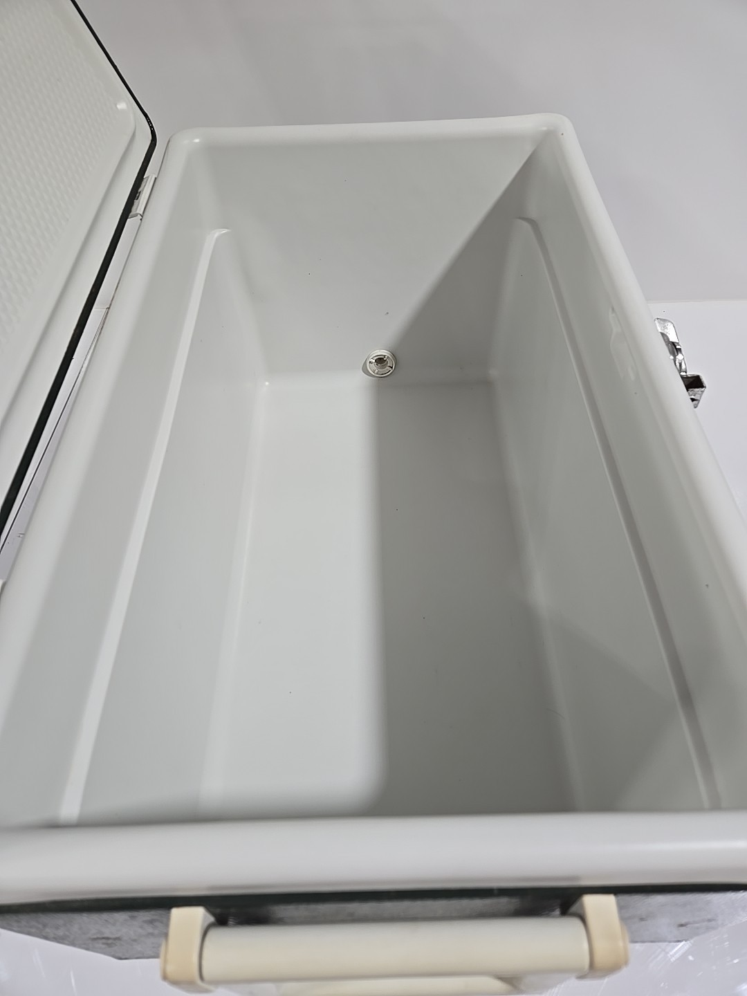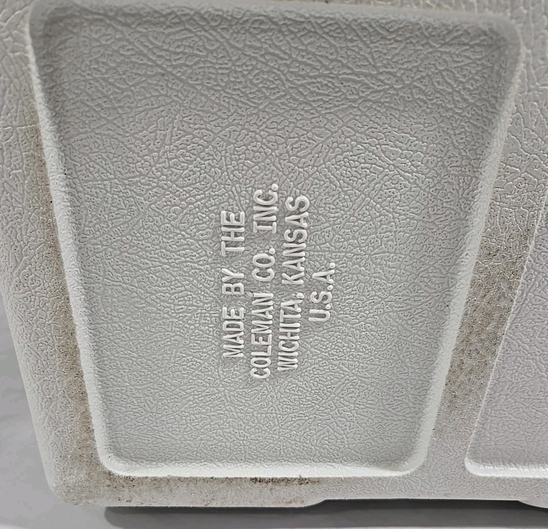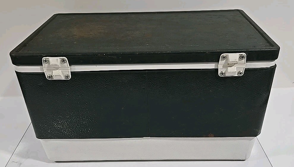 Pre-owned. This cooler has some surface rust on the outside but overall is in really good condition for its age. The latch, hinges, and plug still work great.