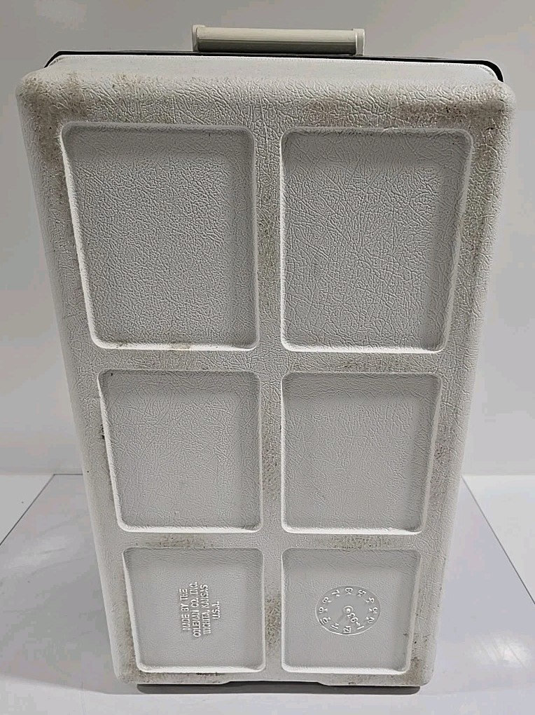 The Vintage Coleman SteelBelted Metal Green White Cooler Ice Chest is a classic and durable option for camping and outdoor activities. This can cooler, featuring the trusted Coleman brand, is designed with a steel-belted construction for added strength and durability. The green and white color scheme adds a retro touch to your camping ensemble, making it both functional and stylish for all your outdoor adventures.