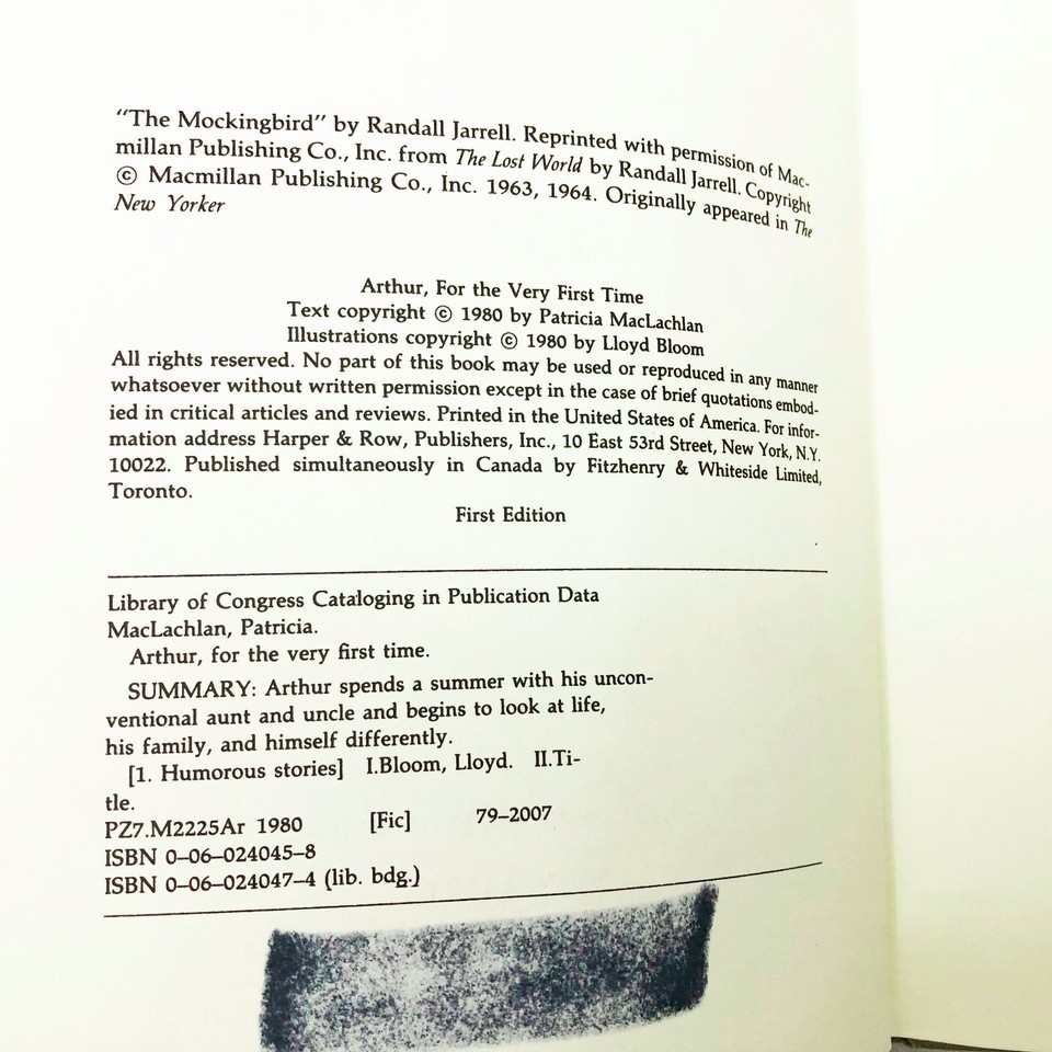 Arthur, For the Very First Time by Patricia Maclachlan and illustrated by Lloyd Bloom, 117 pages hardcover with dust jacket.