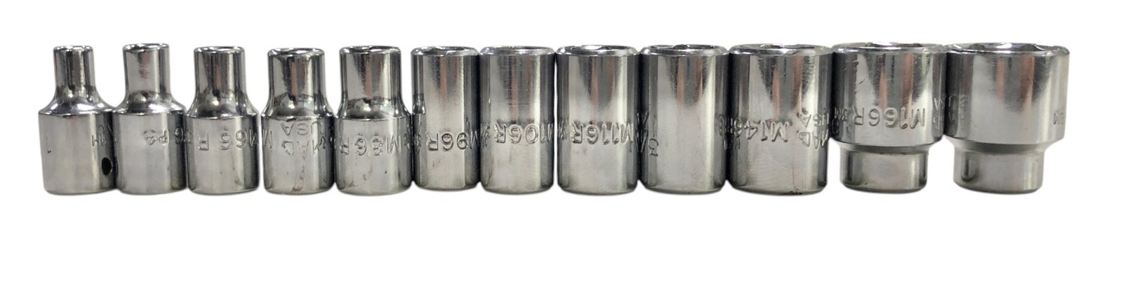 Category: Loose hand toolsType: SocketsBrand: MacModel number: Metric Intermediate Socket Set 6PTSize: 12PCColor: ChromePower source: Hand-heldDrive Size: 1/4Case included: noCondition:UsedNotes:1/8 - 9/16