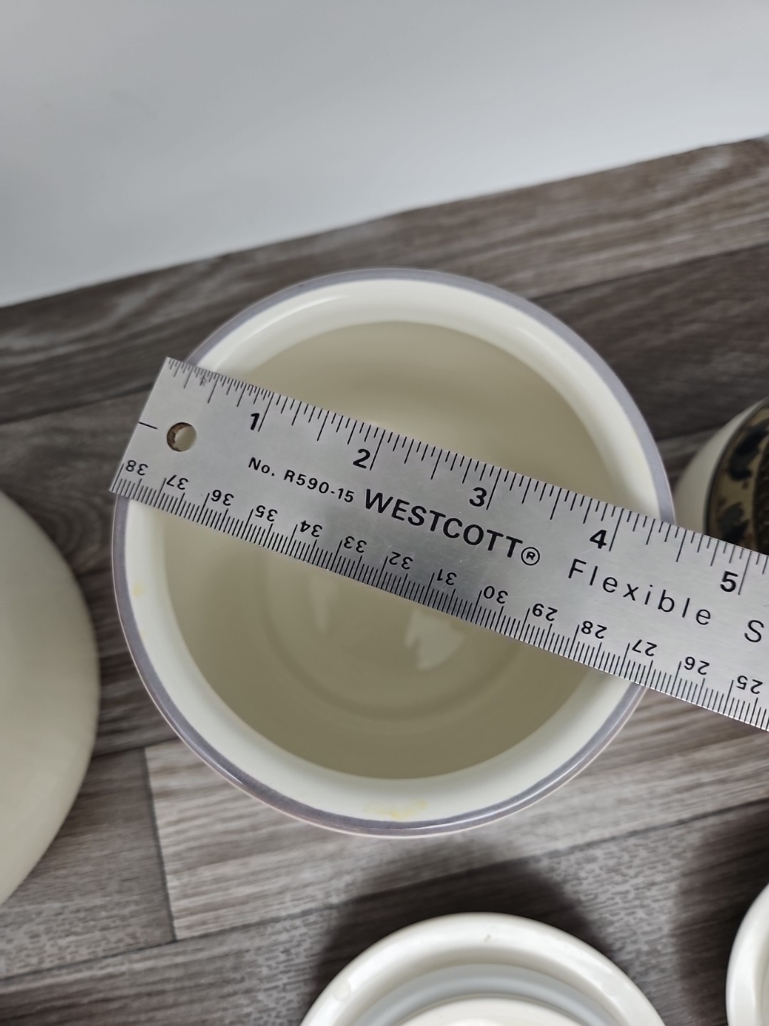 The Mikasa Intaglio ARABELLA set of 3 Canister Set includes items with heights of 6.5 inches, 5 inches, and 4.5 inches, all in Arabella pattern.