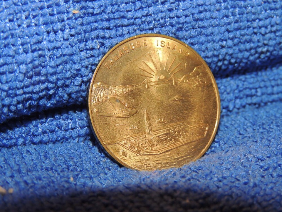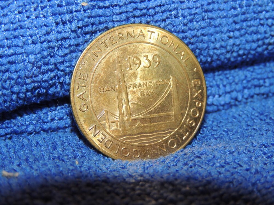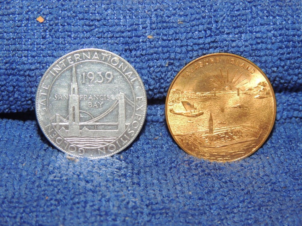 TWO TOKENS FROM THE GOLDEN GATE INTERNATIONAL EXPOSITION IN SAN FRANCISCO. ONE LOOKS BRASS / BRONZE AND IS THE TREASURE ISLAND TOKEN. THE OTHER IS ALUMINUM AND IS FOR THE UNION PACIFIC RAILROAD. I AM NOT AN ANTIQUITIES EXPERT - PLEASE LOOK AT THE PICTURES CAREFULLY.