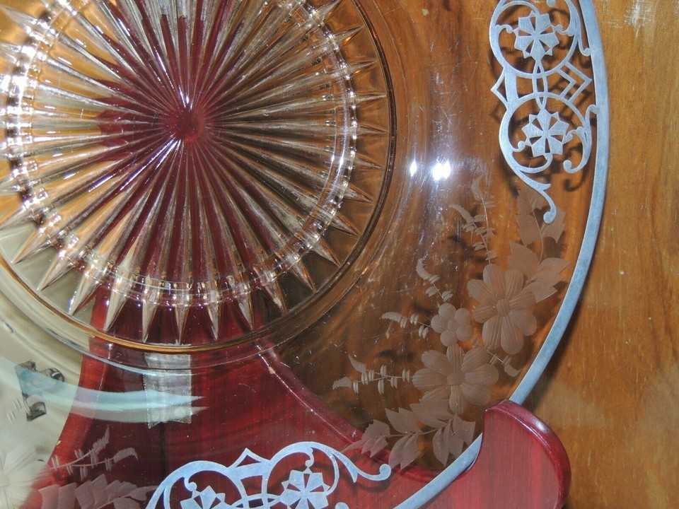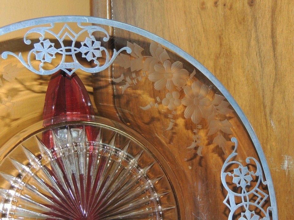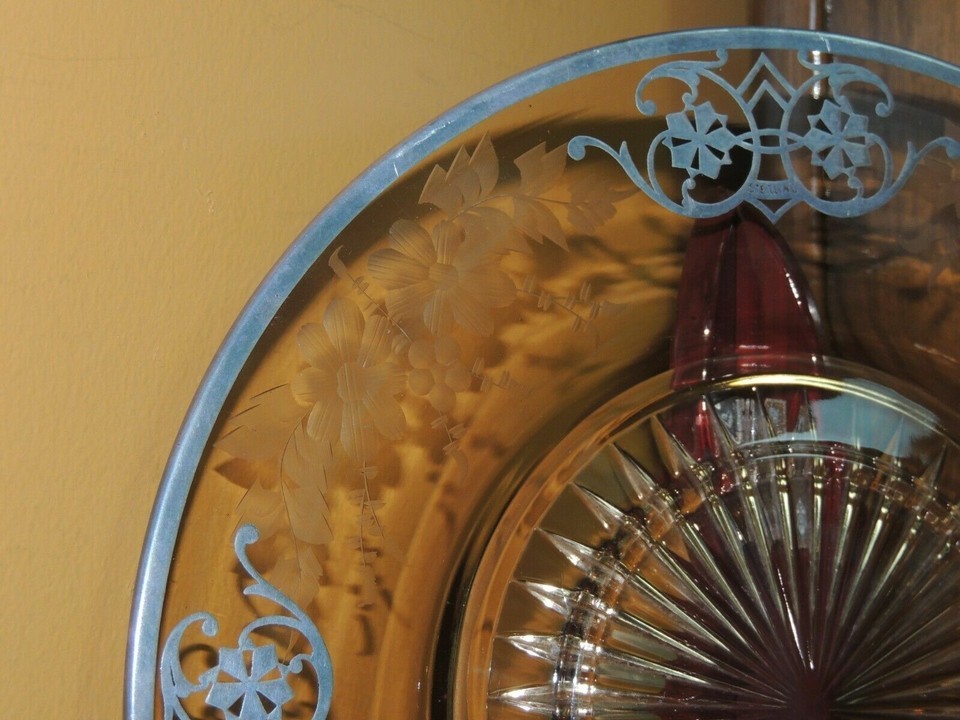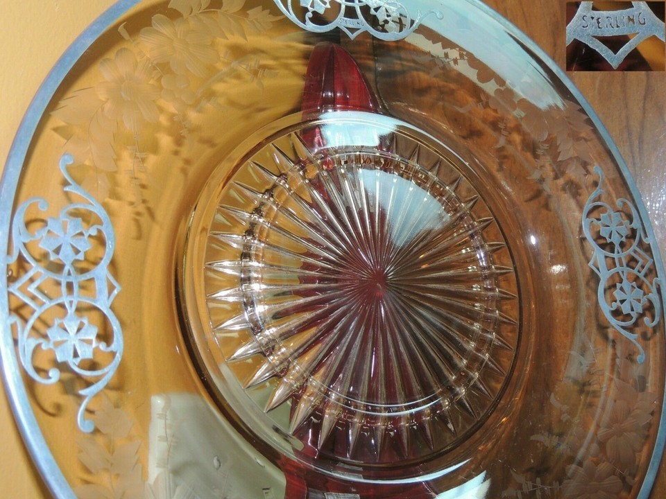 Sterling overlay Serving Plate 10" Etched Pink Depression era oe earlier Glass