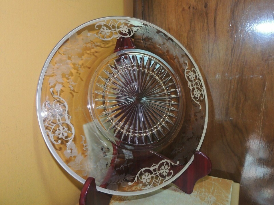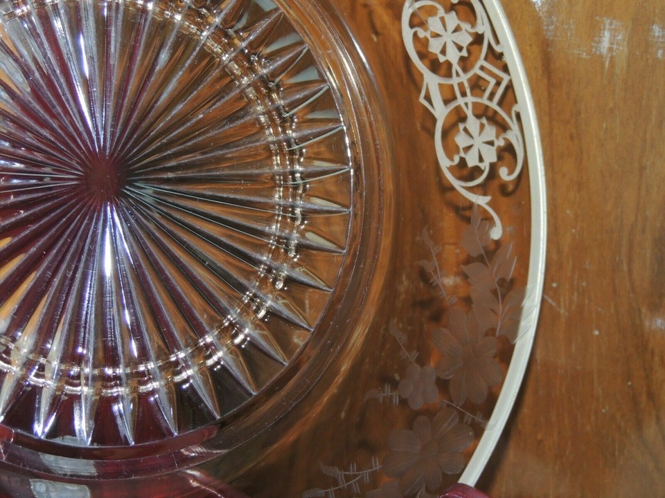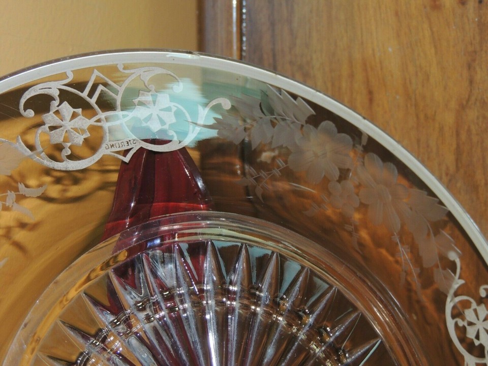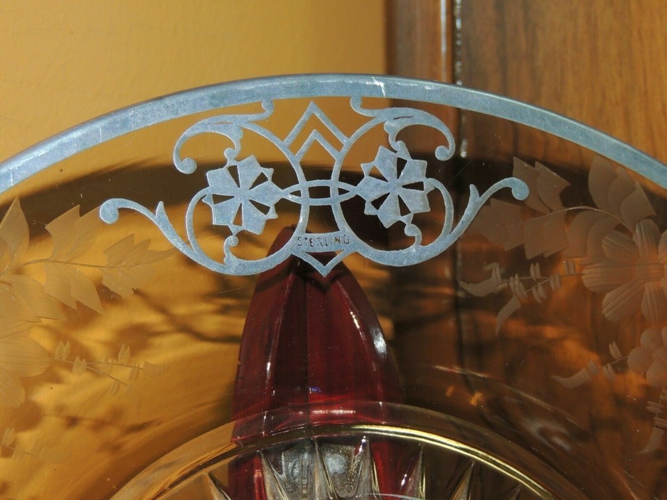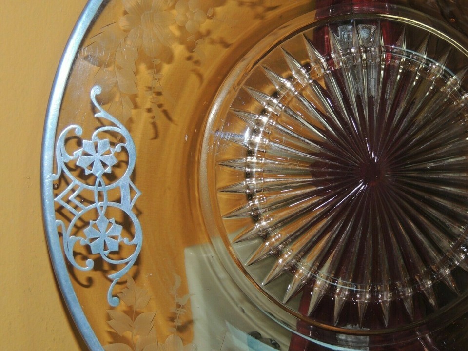 Sterling overlay Serving Plate 10" Etched Pink Depression era oe earlier Glass