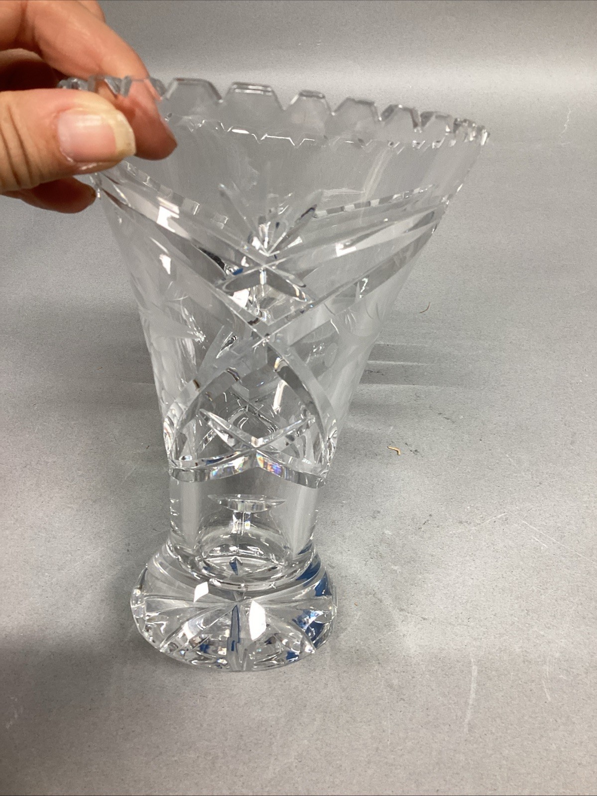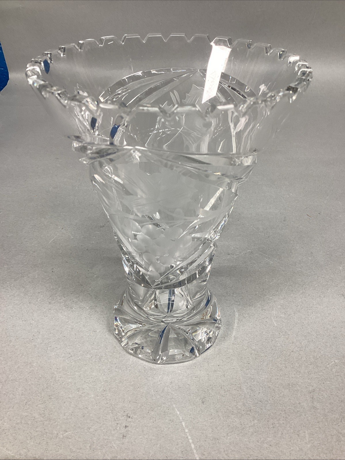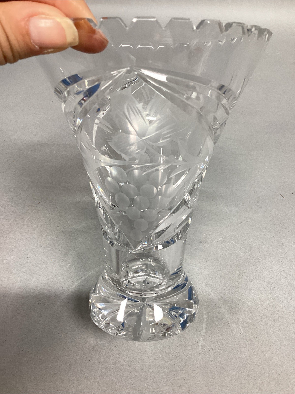 Lausitzer Glass 24% Lead Crystal Etched Hand Cut Vase Germany Grape Pattern. No cracks or chips but it does have some scratches. Measures 6.25?Hx4.5?D