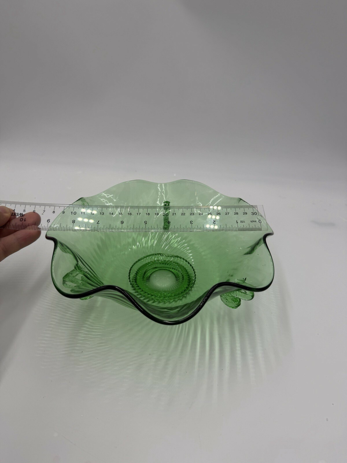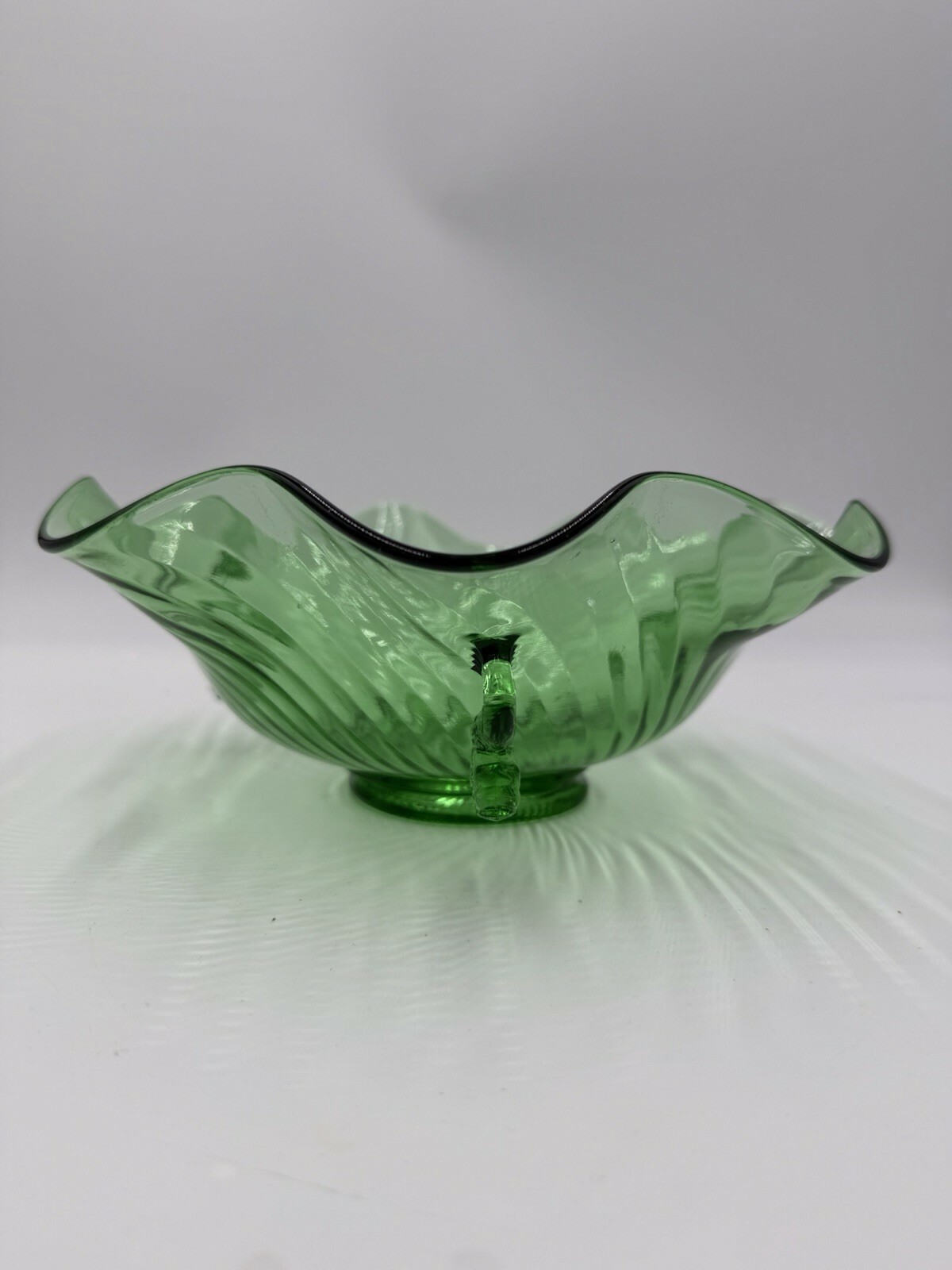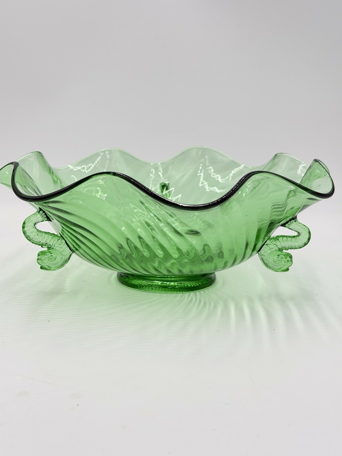Rare Fenton Art Glass Green Emerald Scalloped Dolphin Art Deco Candy Bowl 3”x9”h