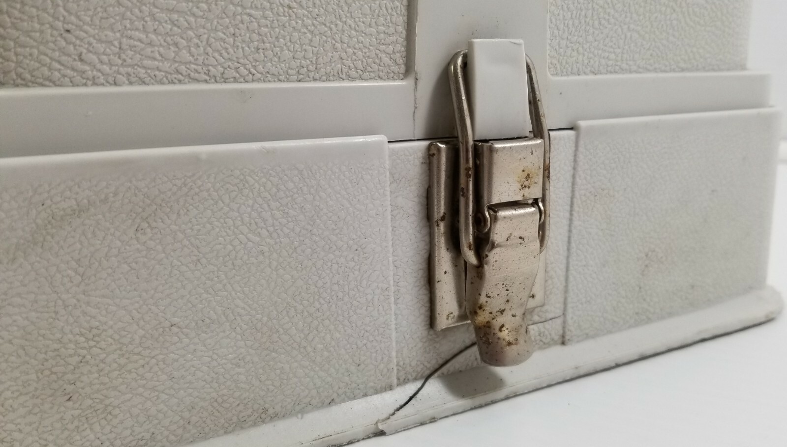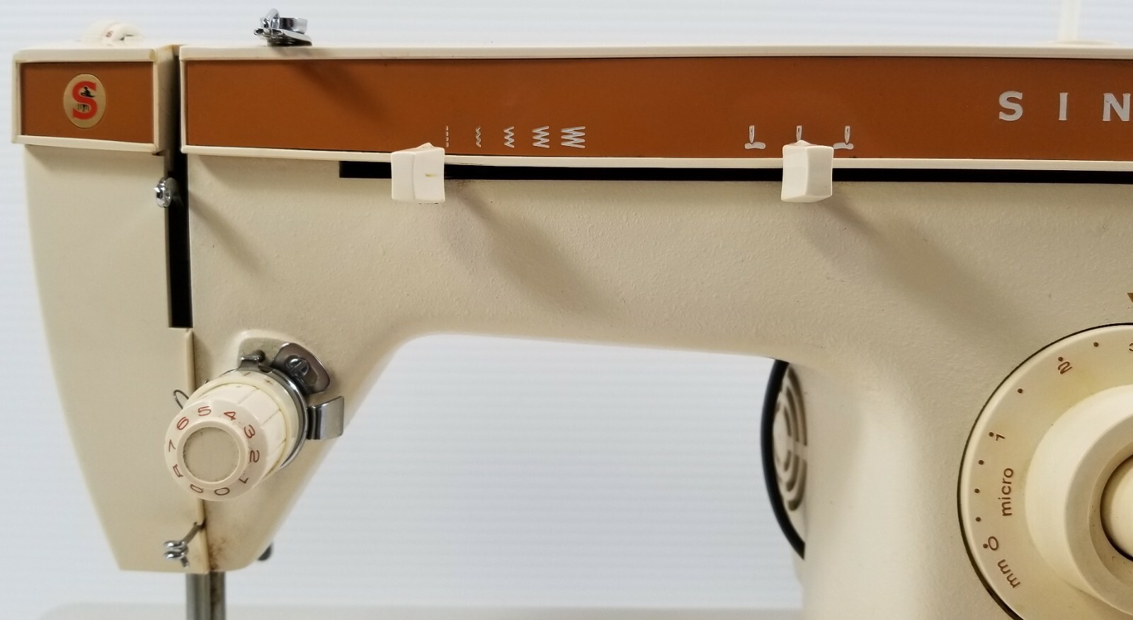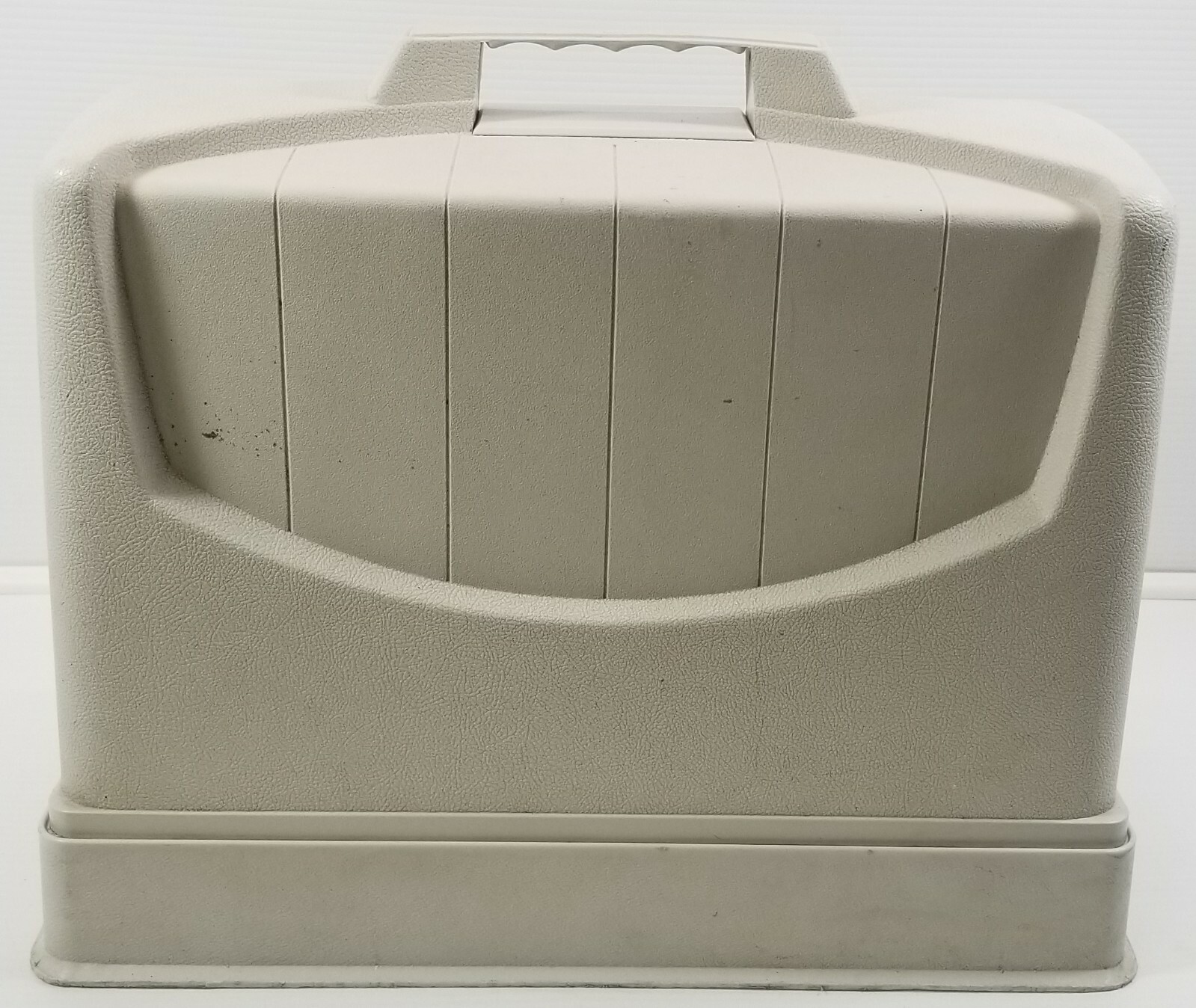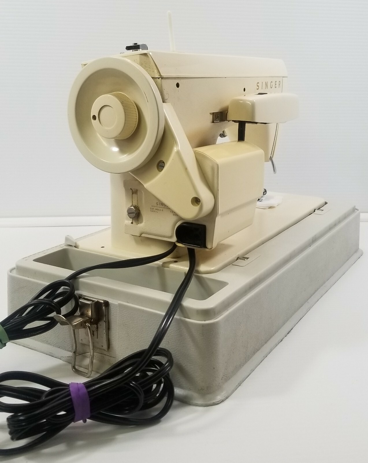 Machine is in overall good, used condition with some signs of age and use. It was in good working condition but recently stopped pulling thread. It might be a simple fix and/or adjustment but has not been looked at professionally. The light bulb is missing and NOT included although will work with a new bulb installed. There is a very slight crack at the bottom base of the plastic case.