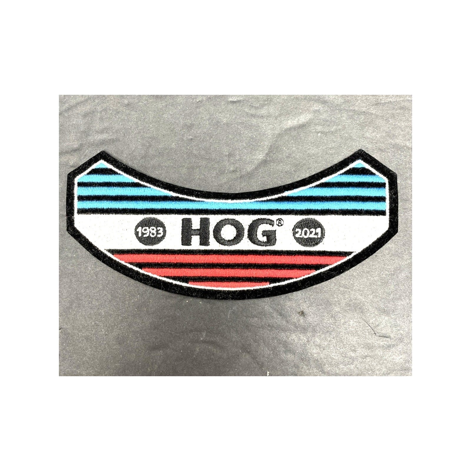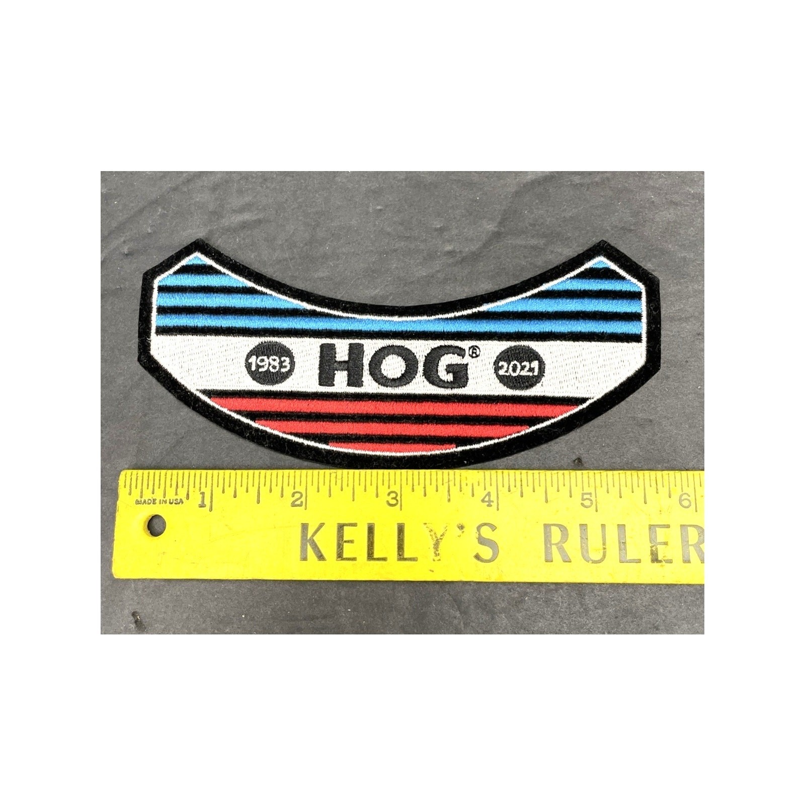 This NEW 2021 Harley Owners Group (HOG) patch features the iconic winged logo in classic black and gold embroidery, designed to be worn on jackets, vests, or gear bags. A must-have for Harley-Davidson enthusiasts, this official rocker-style badge proudly displays membership in the worldwide HOG community.