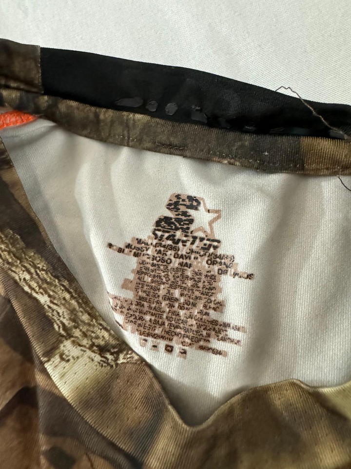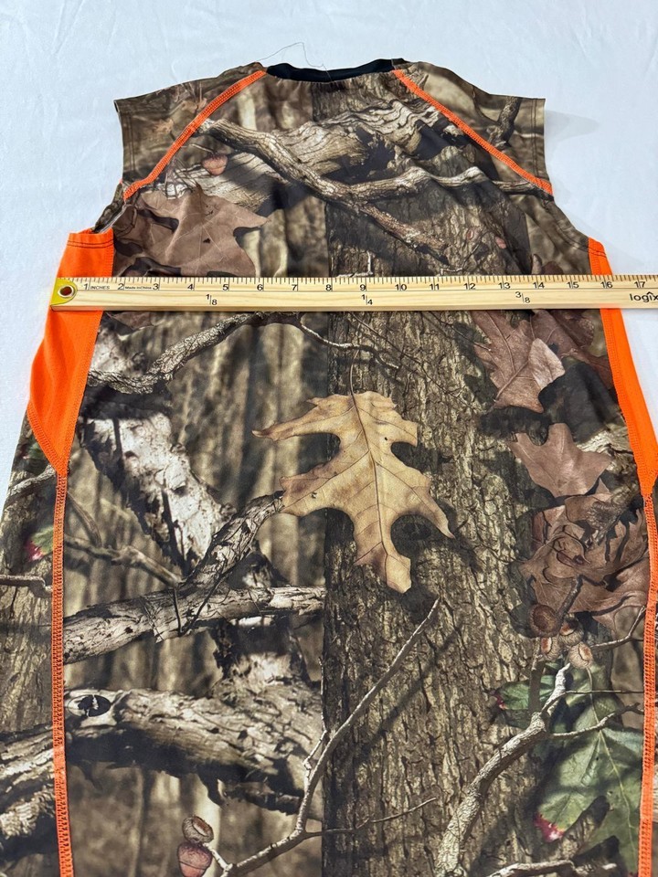 The product is a men's sleeveless shirt designed by Starter in Mossy Oak Break-Up Infinity Camo pattern with a combination of camo and orange colors. It is made of polyester material and features a jersey style with 3-D clothing details. This shirt is specifically tailored for hunting and comes in size small. The design is suitable for outdoor activities and hunting excursions, providing both functionality and style for the wearer.