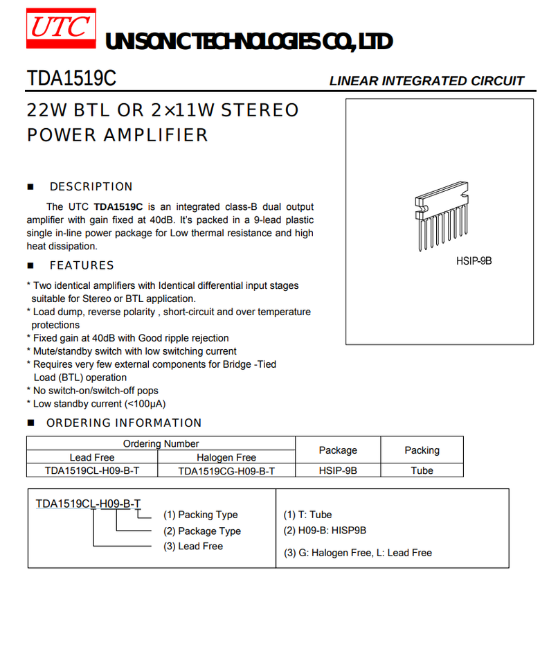 Pack of 5 Pieces - TDA1519CL UTC Dual Output Amplifier 22W BTL 2x11W Stereo Amplifier IC HSIP-9B