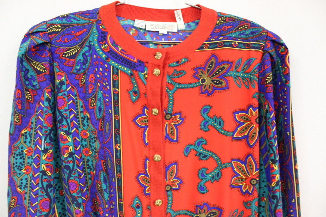 VTG 80s Janan Studio Cardigan Blouson Print Sweater Gold Buttons Dynasty Mob S