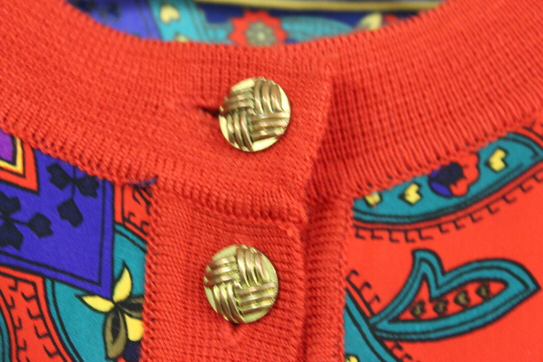 Rare 1980s Janan Studio Ltd. cardigan sweater with padded shoulders, a blouson fit, and wide 4" ribbed waistband. Boldly printed silky polyester front in red and blue, trimmed with matching ribbed knit at waistband, cuffs, and neckline. Finished with ornate gold buttons down the front. Made in Korea.