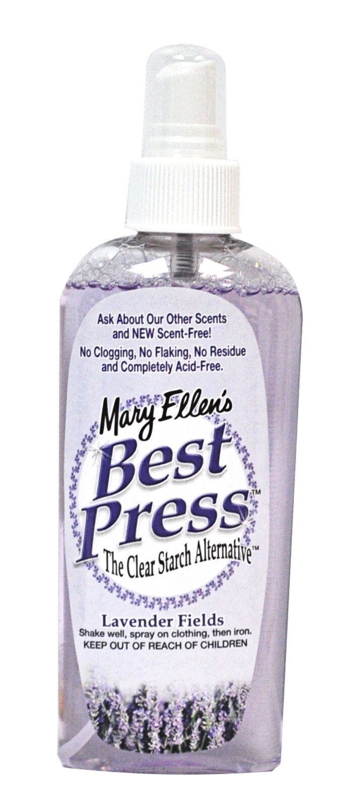 Best Press Clear Starch Alternative Lavender Fields. With Best Press, there?s no flaking, clogging, or white residue on dark fabrics. A special stain shield protects fabrics, and the product helps resist wrinkles. Best of all, it?s more effective than any starch you?ve ever used. Try Best Press today- you will never go back to ironing with spray starch! It?s in a non-aerosol clear bottle, so it?s environmentally friendly and you can see how much is left, too. 6 FL OZ. - with pump spray. Manufacturer Part No.: 560036 CHK-80057Lavender
