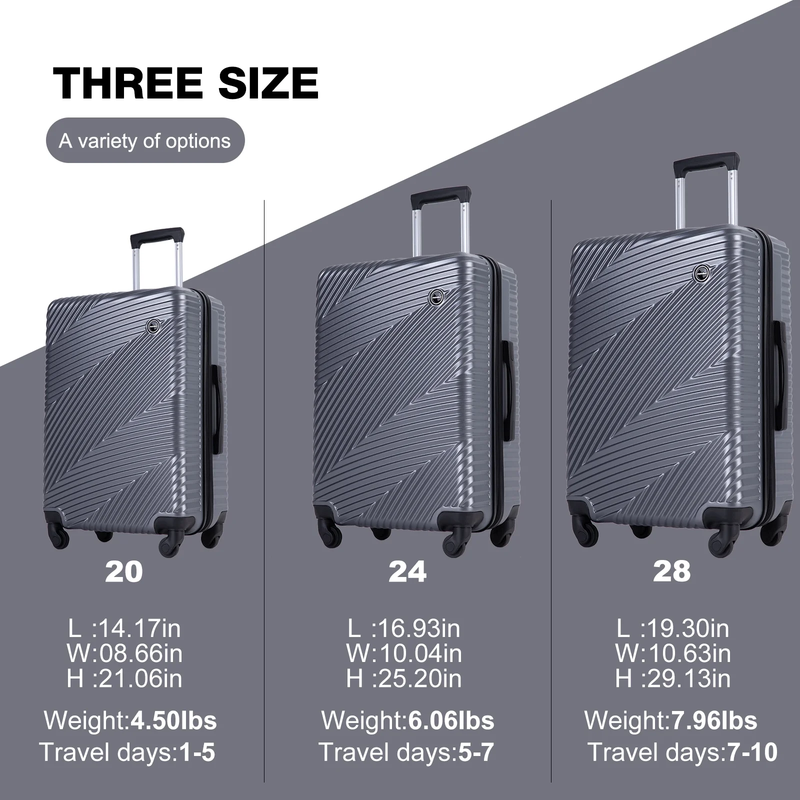 ?HIGH QUALITY LUGGAGE SETS?: The luggage sets are made of thick materials for hardshell, which makes them more durable, lighter, and impact-resistant during travel. The textured finish is not only fashionable but also scratch-resistant. The 20-inch carry-on meets most U.S.-based and international airline carry-on size requirements, and the 24-inch and 28-inch are ideal for checked luggage, making them the best choice for long trips and business trips