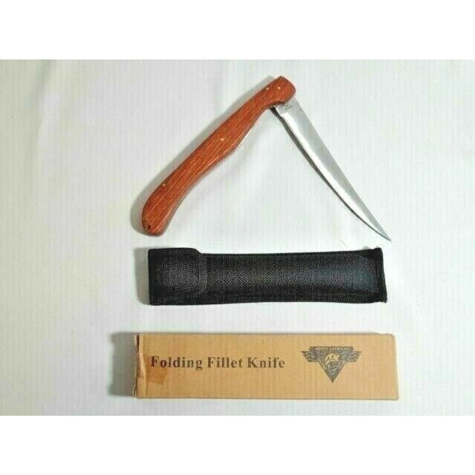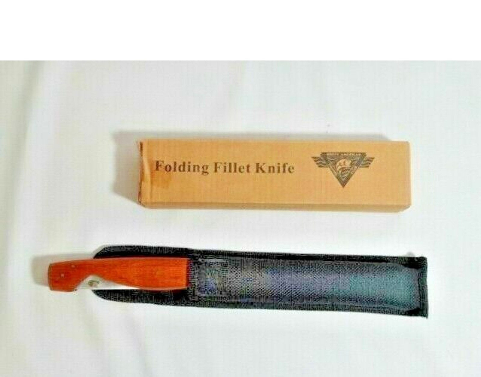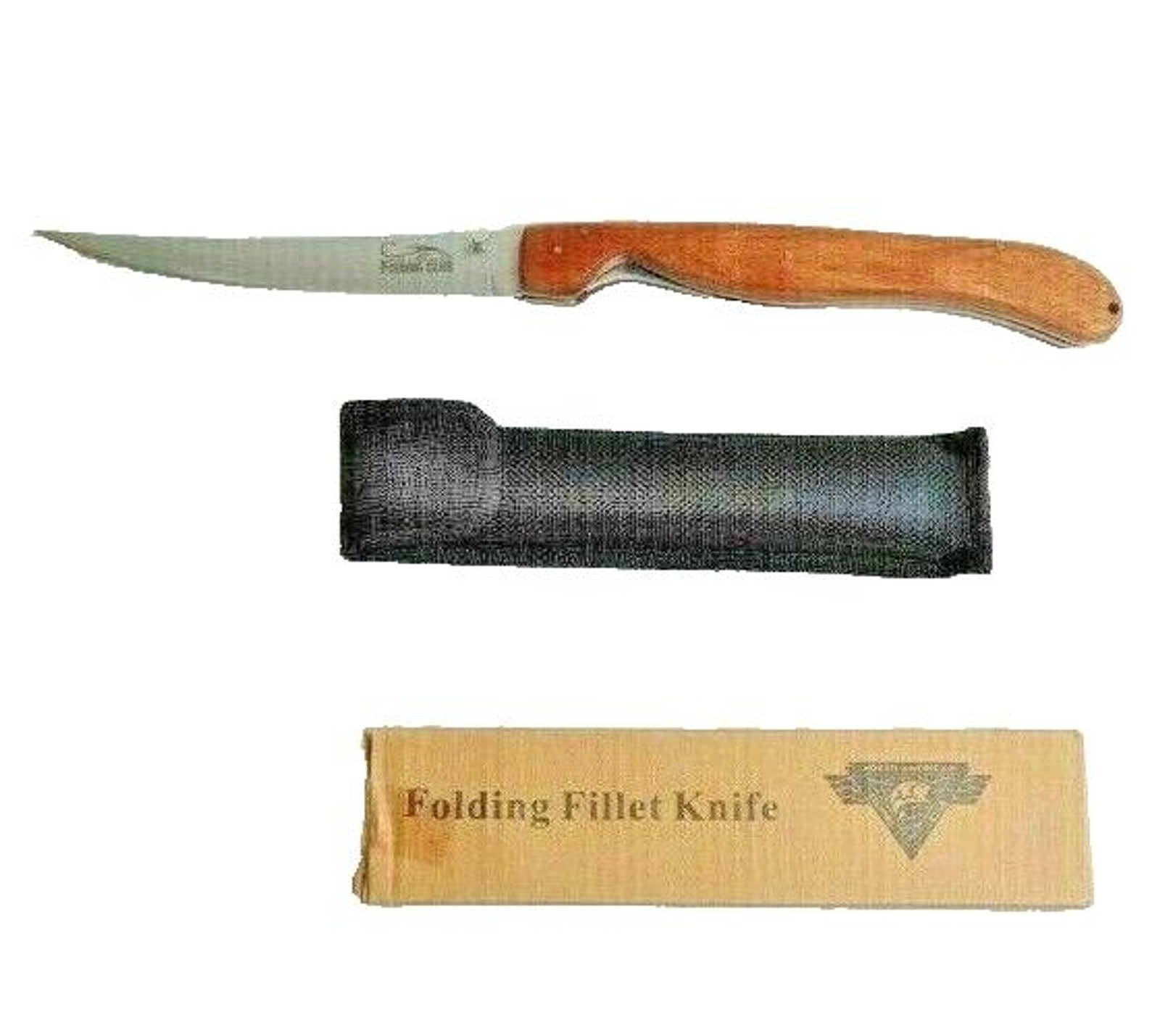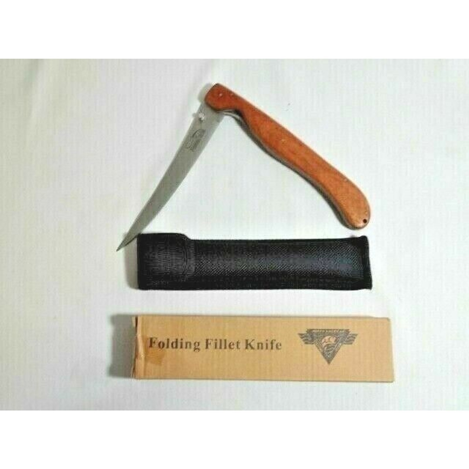 North American Fishing Club Folding Fillet Knife and Sheath Wood Handle Gift NEW