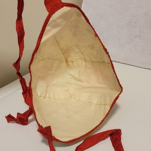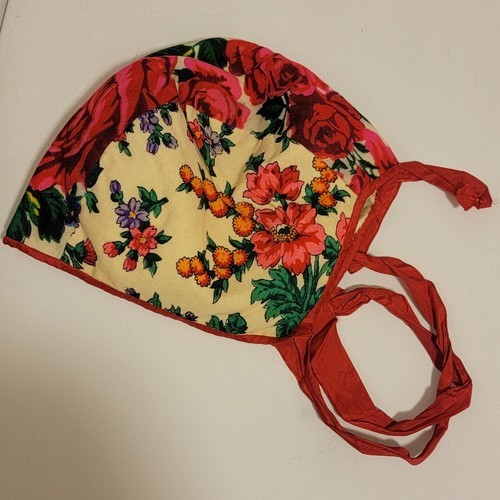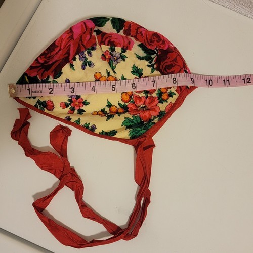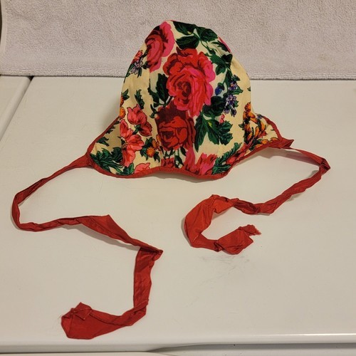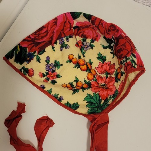 Stunning Vintage Child's Costume Floral Folk Art Swedish Bonnet Hat 1950s Ribbon Tie Neck. Trimmed with red bias tape ties.
