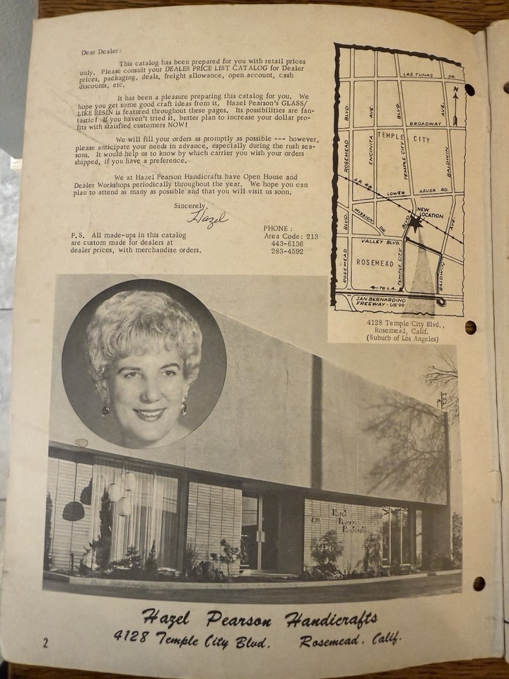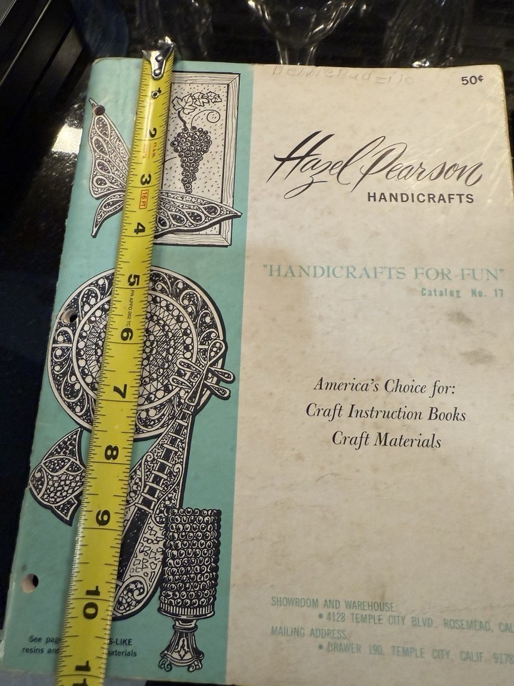Explore mid-century creativity with this original Hazel Pearson Handicrafts catalog, Handicrafts for Fun, Catalog No. 17, printed around 1968?1970. Includes charming black-and-white illustrations, project instructions, and craft materials ranging from resin kits to mosaic supplies.