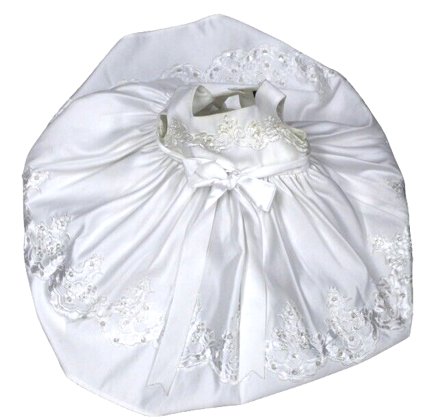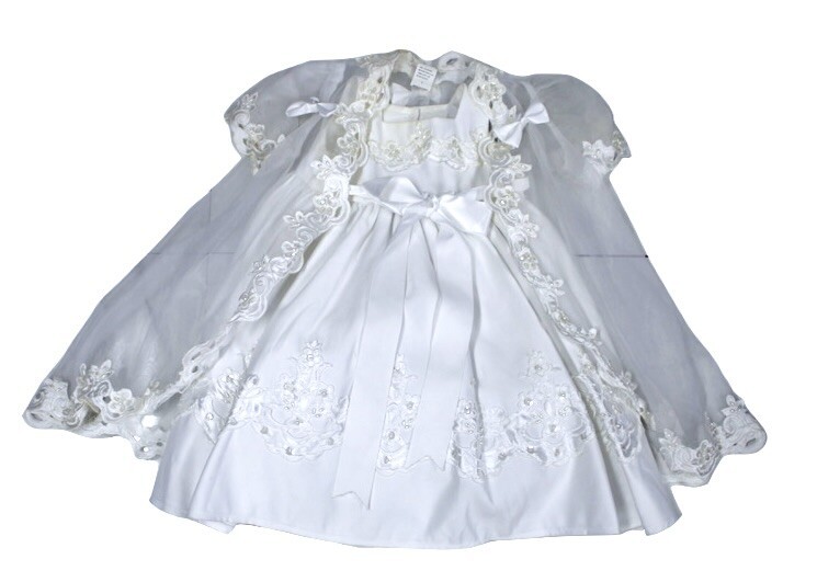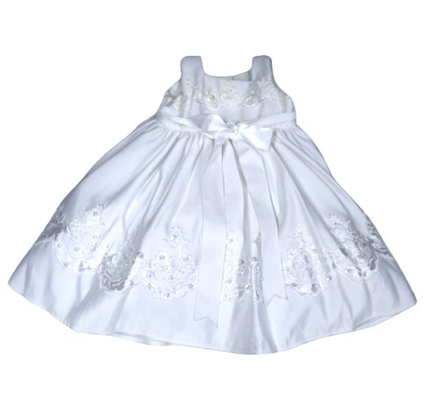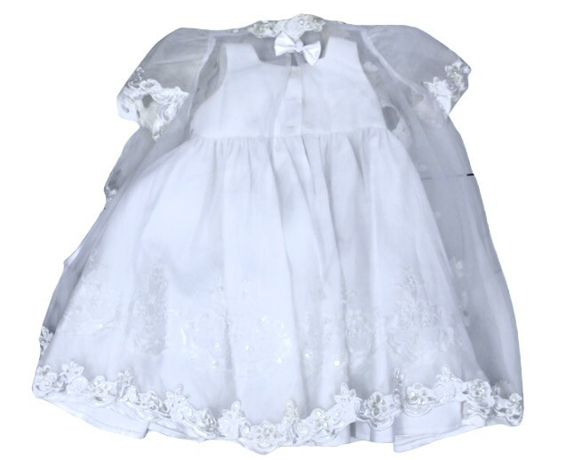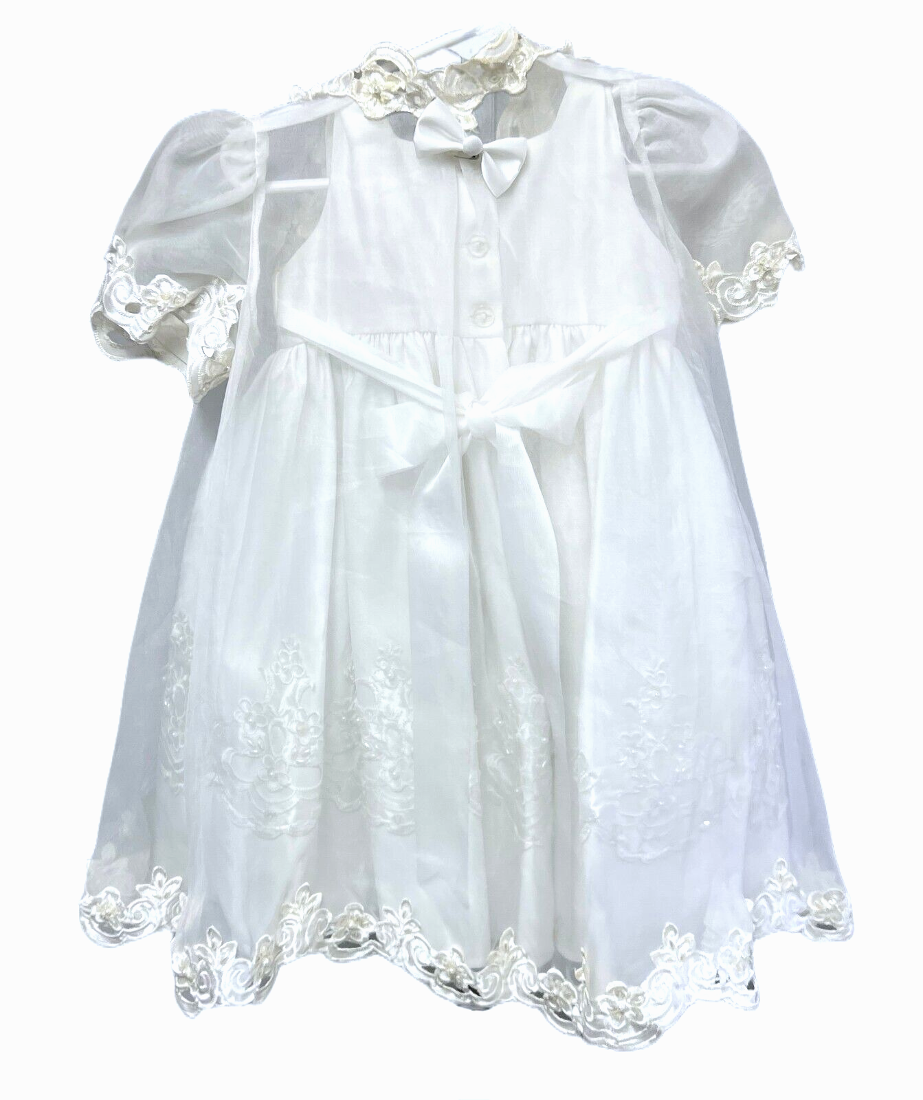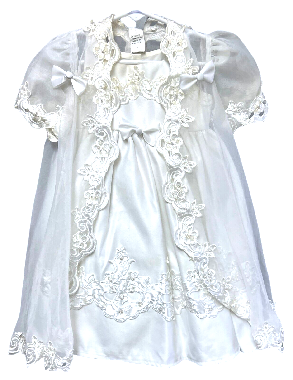 White cotton/synthetic blend dress with sheer overlay jacket. Embellished with bows, beads, and sequins.