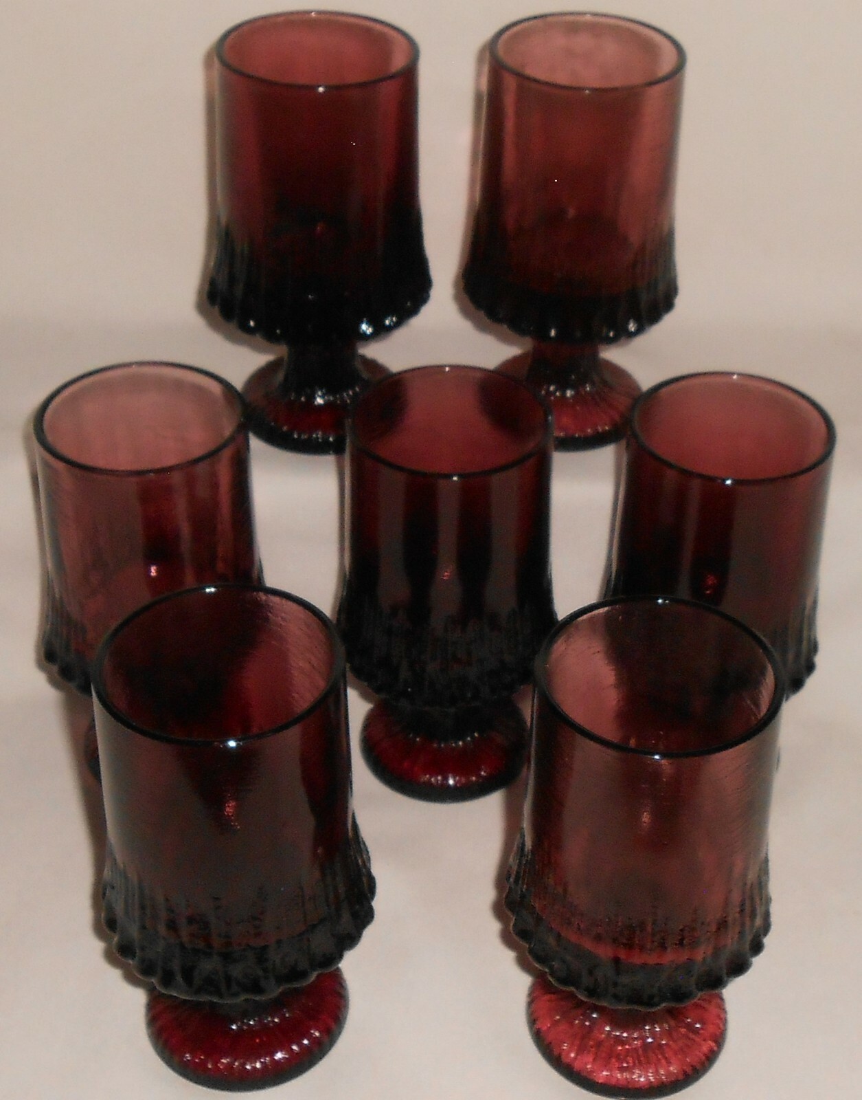 This is a Set of (7) 5 3/8" Tall 6 oz Heavy Pressed Glass Plum Color Wine Stems from Smith Glass in the Mid Century Modern Sculptura 2 Pattern that was mfg from 1969 - 1978. They are all in good pre-owned condition with no chips or damage.