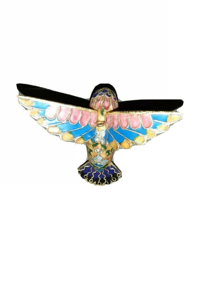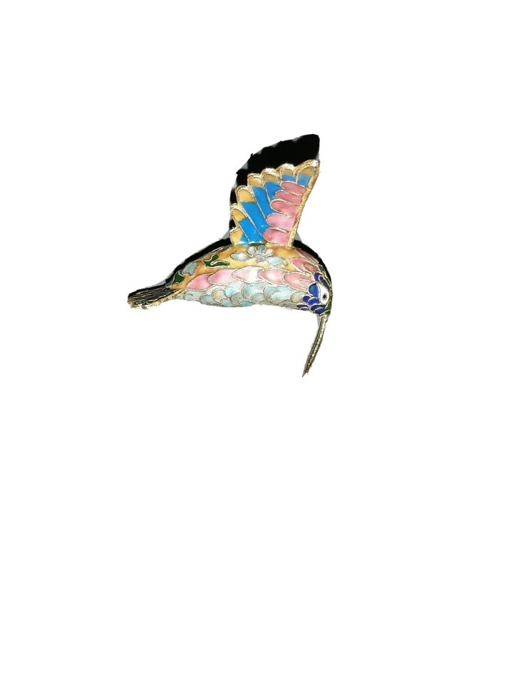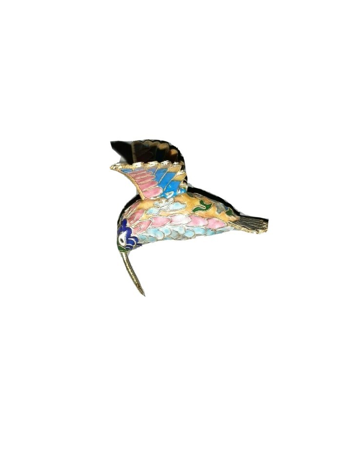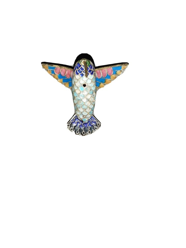 Cloisonne Enameled Metal Blue Pink Yellow Hummingbird Ornament 2-3/4" x 3-1/2