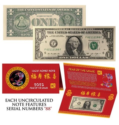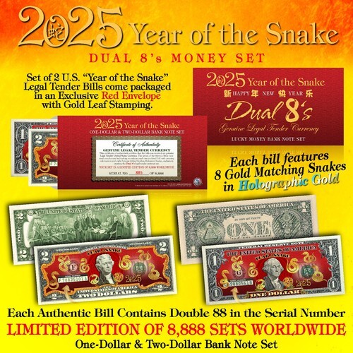 POLYCHROMATIC COLORIZATION!! This is a Special Release to celebrate the 2025 Chinese New Year, Year of the SNAKE. This is an opportunity to acquire a true Collector?s Item?a GENUINE LEGAL TENDER UNITED STATES $2 Two-Dollar Bill that is enhanced with a special Colorization process by The Merrick Mint. This bill is enhanced with 8 SNAKES in FULL COLOR to represent the 2025 Chinese Year of the SNAKE. Number 8 has long been regarded as the luckiest number in Chinese culture, which is the reason 8 Polychromatic Color SNAKES are used on the bill. The Number 8 represents prosperity, success, luck, good fortune, and wealth. Never before has a United States $2 bill been enhanced with such magnificent High-definition colorization, making it the most ornate and historically attractive piece of U.S. currency in the world. Each $2 Bill is in FRESH, CRISP, UNCIRCULATED condition, and was directly removed from untouched wrapped Federal Reserve sealed packs. Former U.S. President Thomas Jefferson is featured on the obverse of the note, along with the special colorization overlay. The Signing of the Declaration of Independence by John Trumbull is featured on the reverse. It is the only U.S. Currency note that features two Presidents, John Adams and Thomas Jefferson, and it is one of the most rarely seen bills in circulation and actual use. This New Year, give a gift of good fortune to family and friends with the famous Polychromatic Colorization 2025 Chinese New Year SNAKE $2 U.S. Bill. Place your order now as they are In-Stock and Shipping immediately. SPECIAL LOW PRICE: $14.95. We also ship internationally. SPECIAL NOTE: To ensure authenticity, each serial number on this official banknote begins with "00." This security feature distinguishes the 2025 Year of the Snake currency as officially genuine and secure. Only authentic bills will start with this double "00" serial number.
