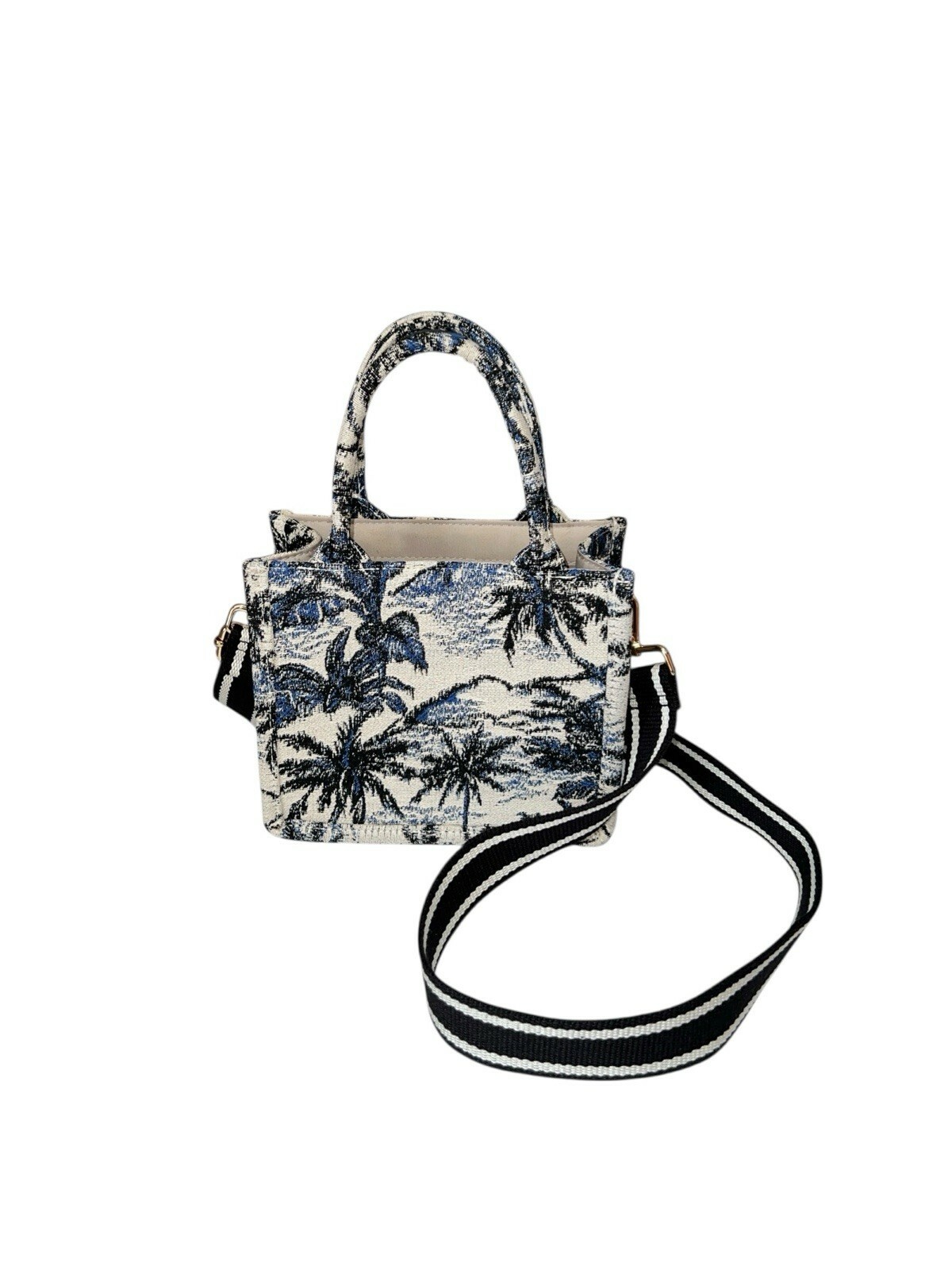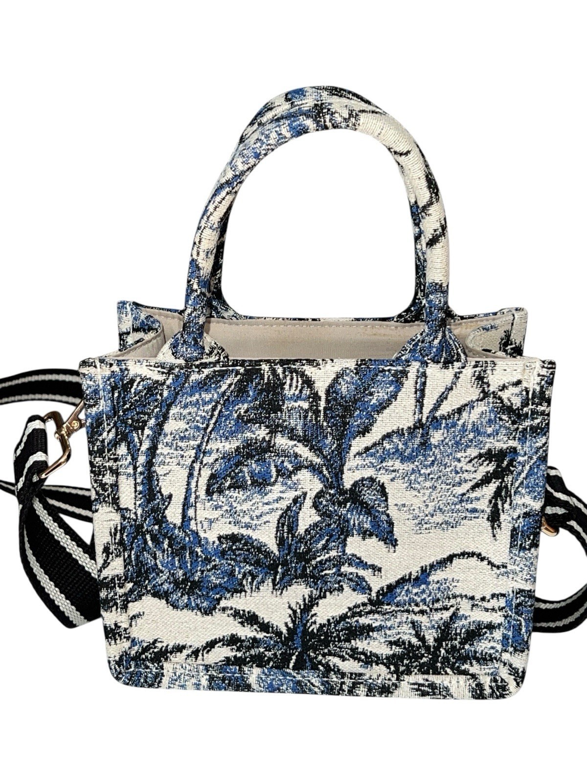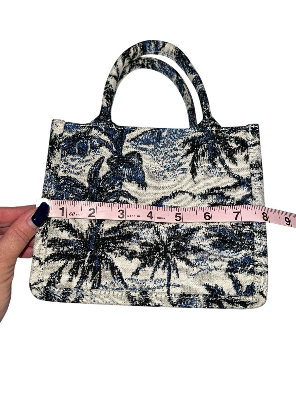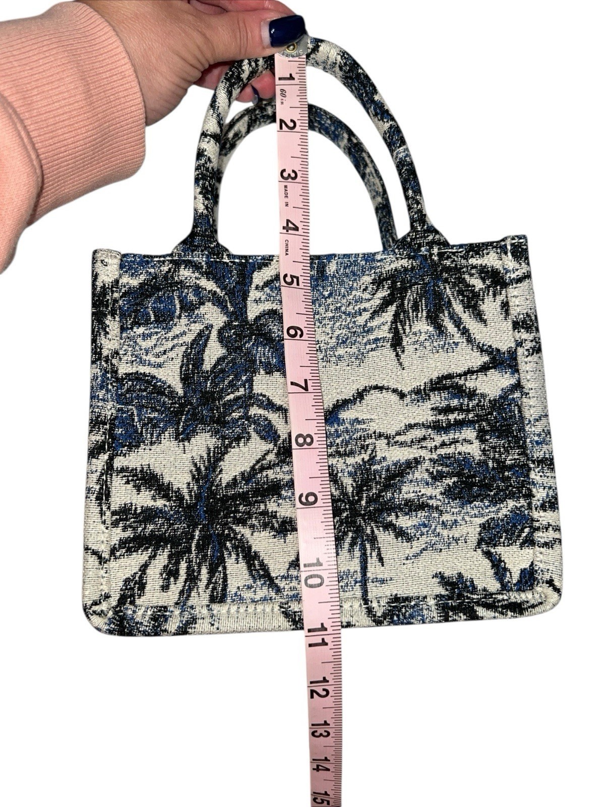 H&M Mini Tote Jacquard Tote Palm Tree Leaf Tropical Bag Crossbody Strap Blue EUC
