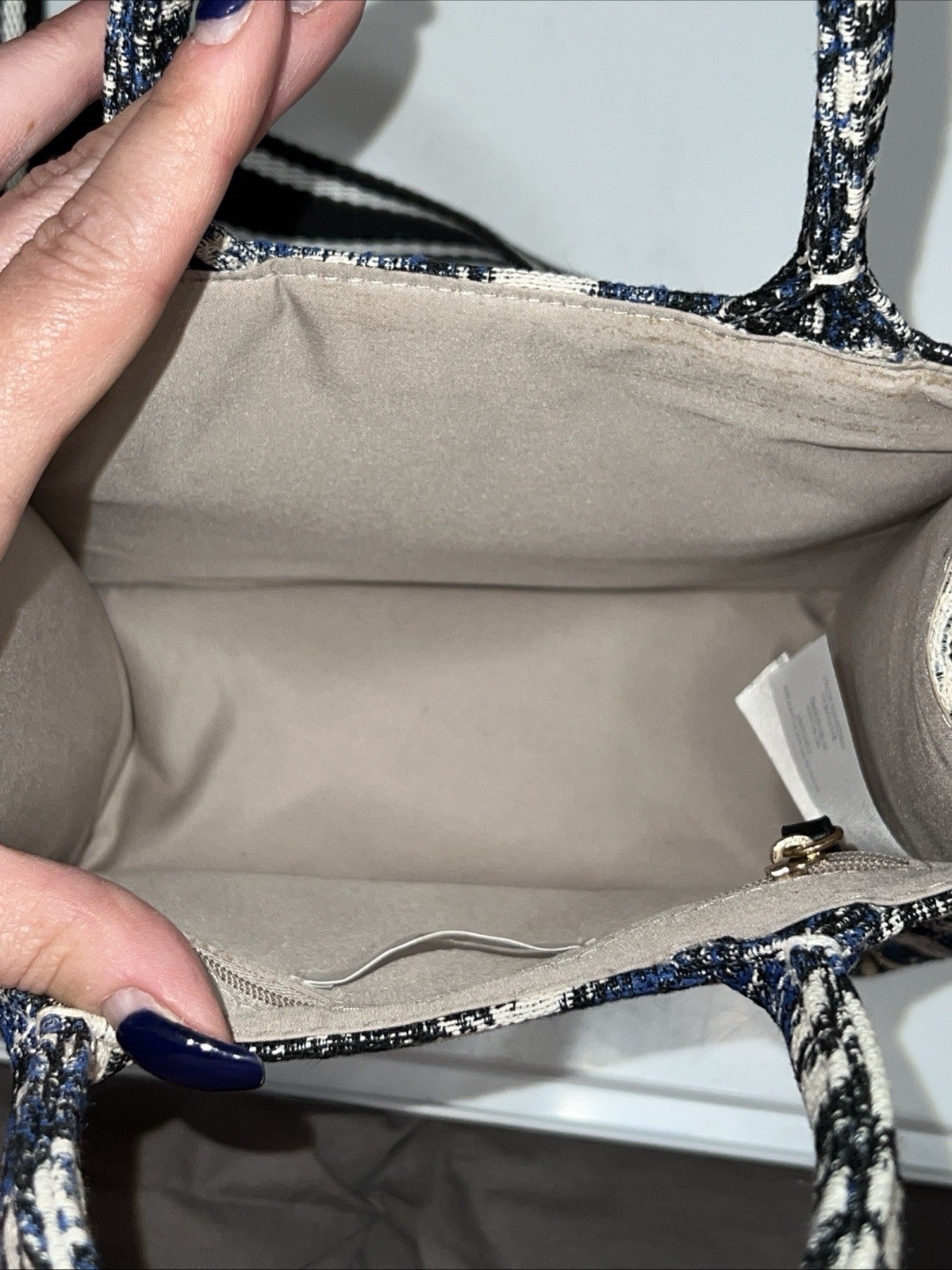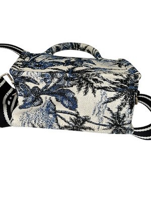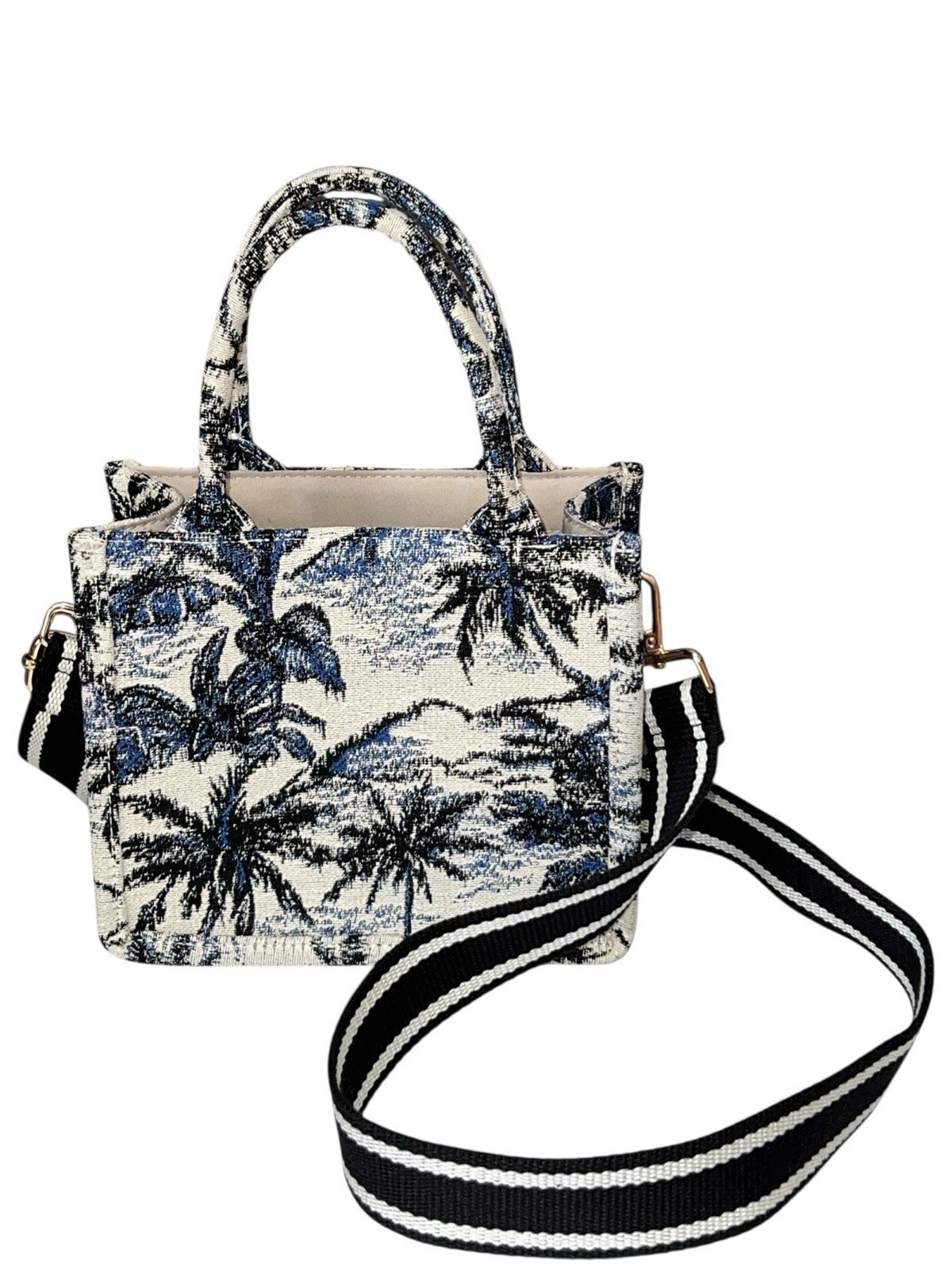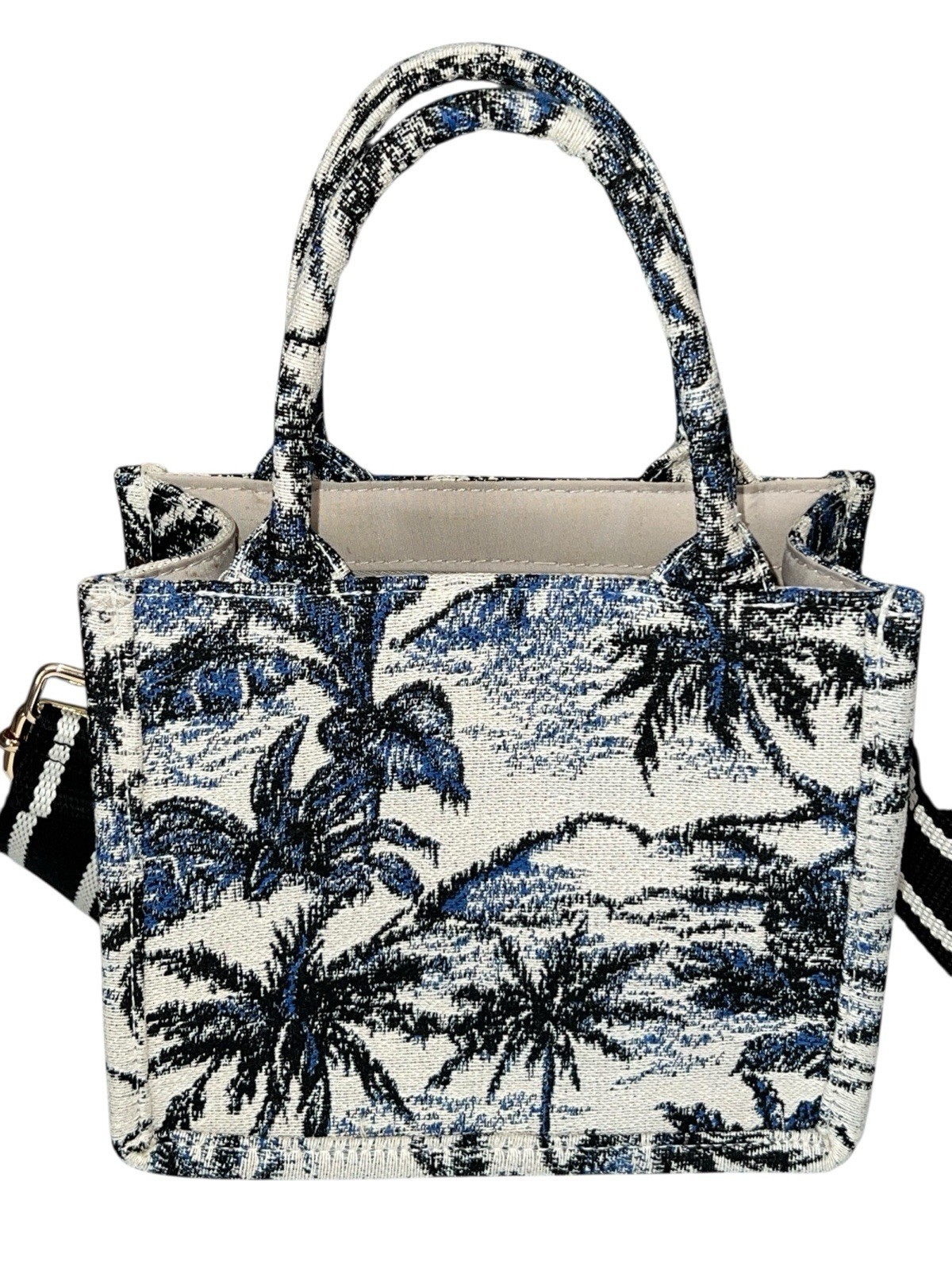 H&M Mini Tote Jacquard Tote Palm Tree Leaf Tropical Bag Crossbody Strap Blue EUC